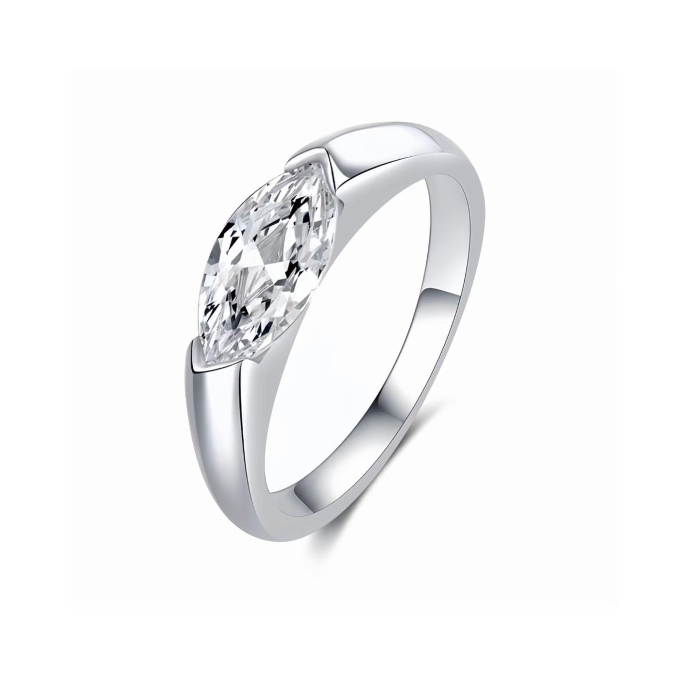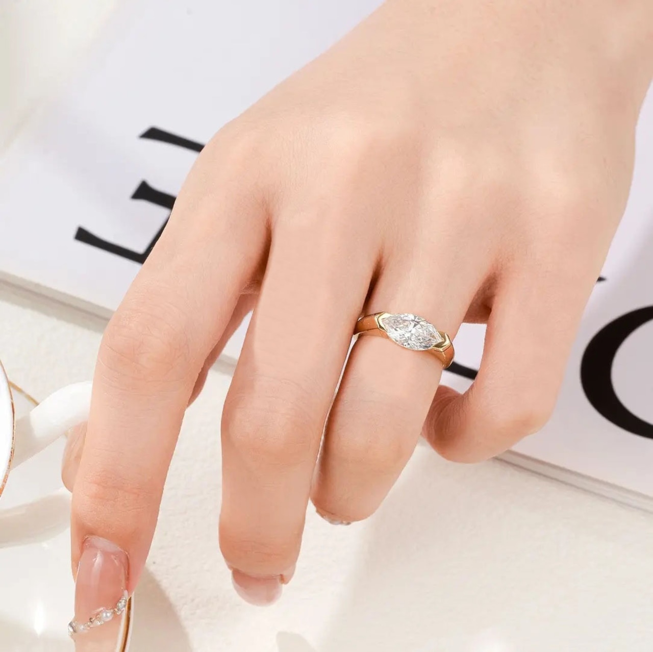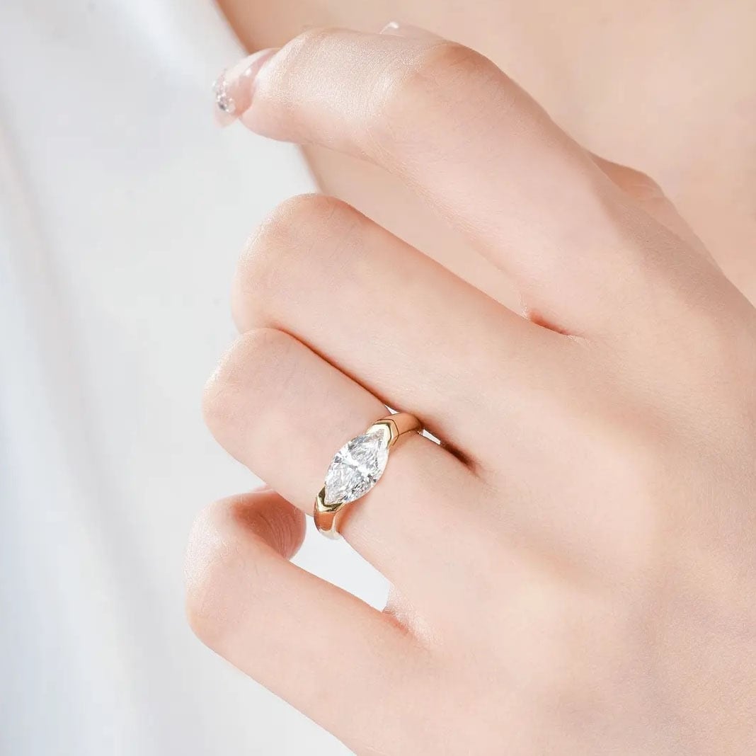 【マーキスカットダイヤモンドのデザイン】独特のマーキスカット(馬眼形)のダイヤモンドを採用しています。この形状のダイヤモンドは、流麗でスリムなラインが特徴で、視覚上に指のラインを引き延ばし、手元をよりスリムで優雅に見せ、一風変わった魅力を引き出します。
