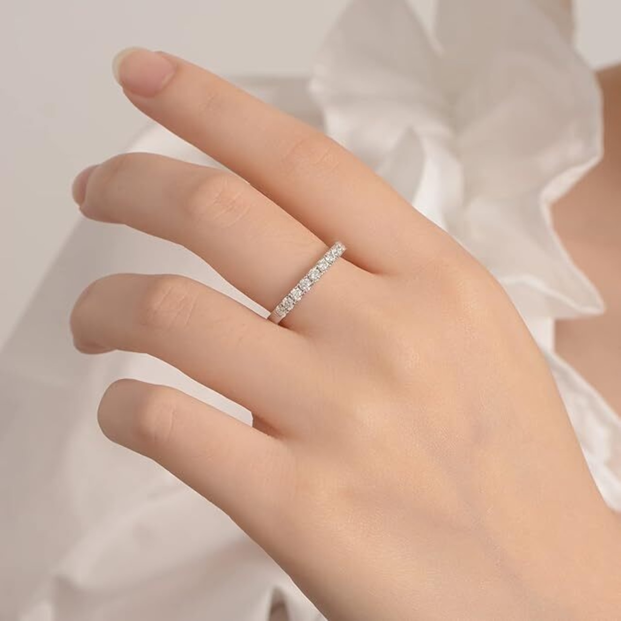 【より輝く本物のモイサナイト】0.7カラット(0.1ct/ 3mm×7石)の本物のモイサナイトで作られています。各モイサナイトは、天然ダイヤモンドのように硬く、輝くよう、厳選されています。