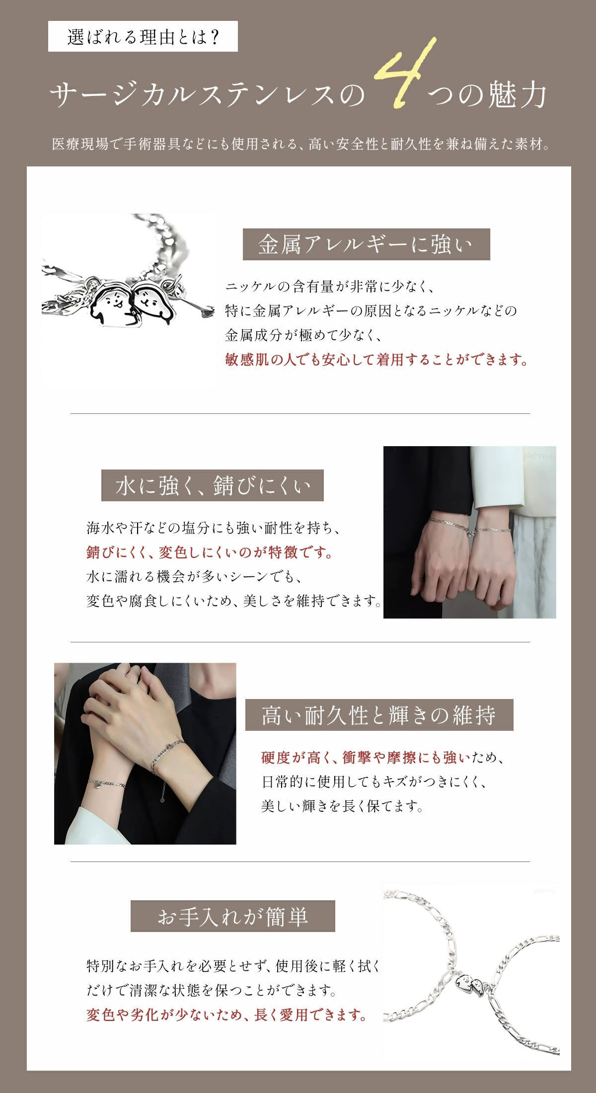 隠しマグネットがチェーンに内蔵されており、近づけるだけで自動吸着。「言葉にする必要のない引力」を象徴しています。