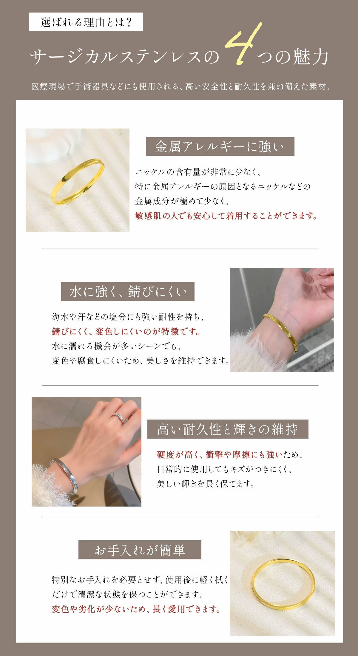 【アレルギー防止特性あり】着用中の皮膚アレルギーの悩みを軽減し、より多くの人々が快適に着用できるようになっています。精巧な工芸で作られており、ブレスレットは中実心のデザインで、質感が抜群で、高品質を誇ります。