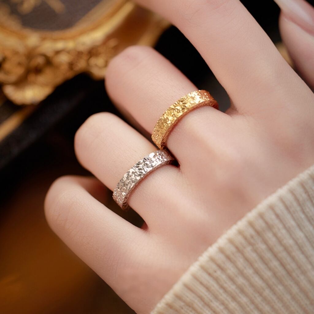 このリングは、きらきら輝く氷のような「クラッシュアイス」テクスチャーを採用。透き通る氷からインスピレーションを得たデザインで、日常のコーディネートや特別な場面で目を引くアイテムに。