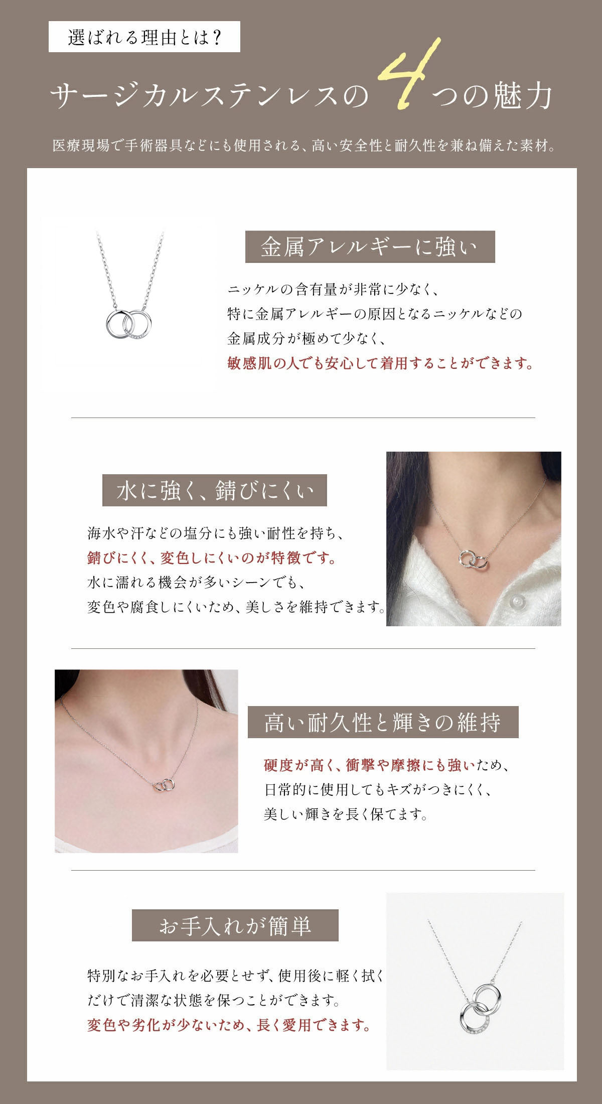 モビウスの輪が互いに絡み合う二重リングのネックレスは、母と娘、あるいは息子/姉妹/友情/恋人間の限りない愛を象徴しています。