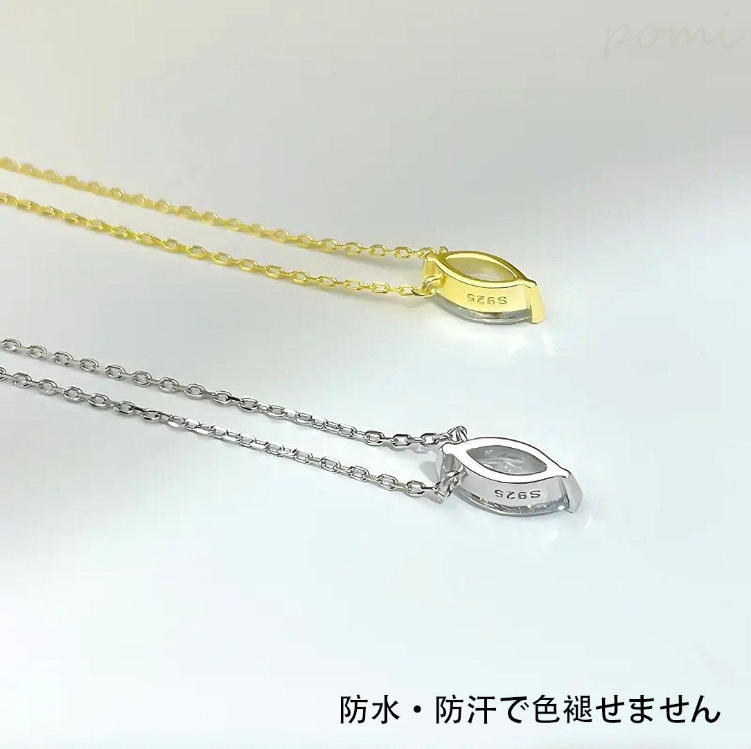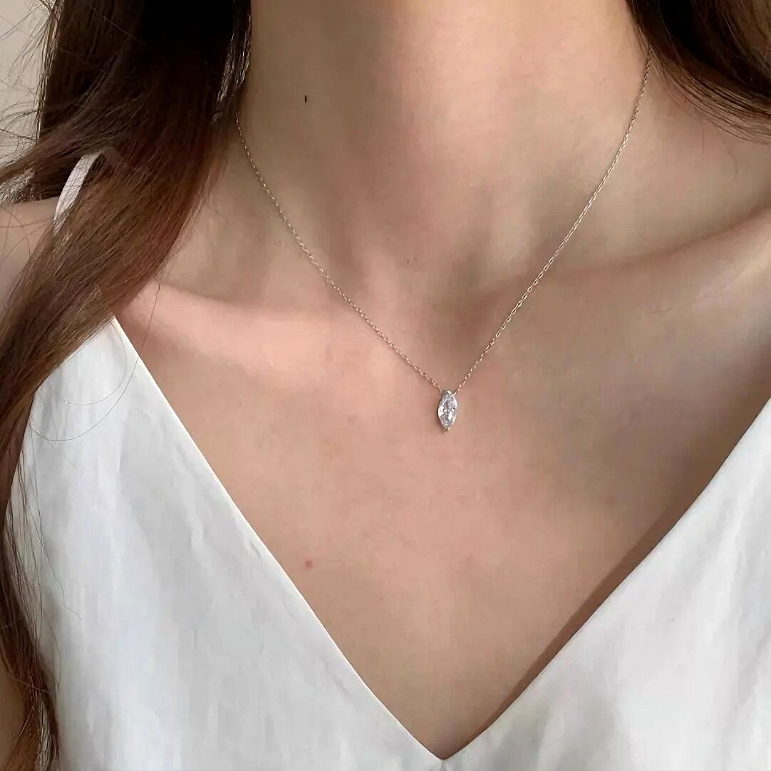 本項鍊の本体は国際規格のS925純銀を用いて精巧に製作され、銀含有量が92.5%と高く、柔軟性と耐酸化性を兼ね備えています。アレルギーを起こしにくく、快適に着用できます。表面は精密研磨処理を施し、光沢が柔らかで繊細で、長時間の着用でも美しい輝きを保ちます。ペンダントトップに嵌められたマーキースカット(馬眼形)のジルコニアは、5A級高品質人工宝石を使用し、カット技術が卓越しており、ダイヤモンドに匹敵する輝きを放ちます。