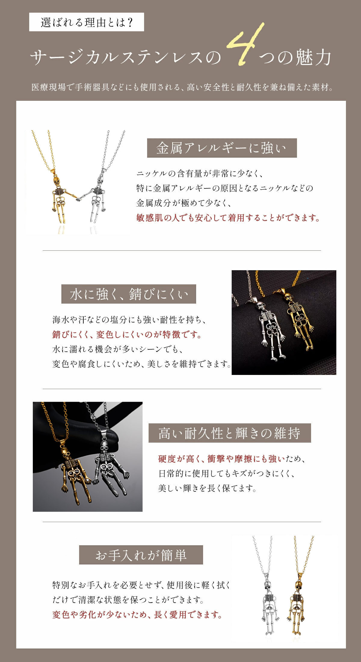 「永遠の絆」を核心のインスピレーションとし、生命と死を象徴する髑髏(ドクロ)の要素と「手を繋ぐ」という優しいイメージを巧みに融合させた。二つの髑髏が手の骨で交差した造型で表現され、ゴシックスタイルのダークな美学を残しつつ、「生死を共にし、離れずに寄り添う」というロマンティックな誓いを伝える。恋人同士が深い愛を表現するにも、親友が心の通じ合いを示すにも、このネックレスは独特な感情を託す絶佳の記念品となる。