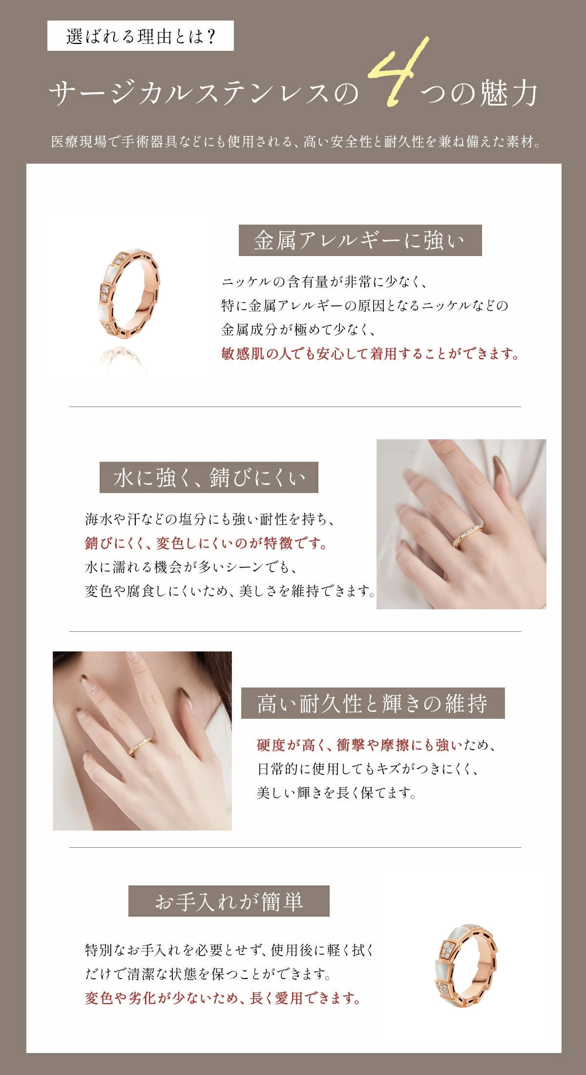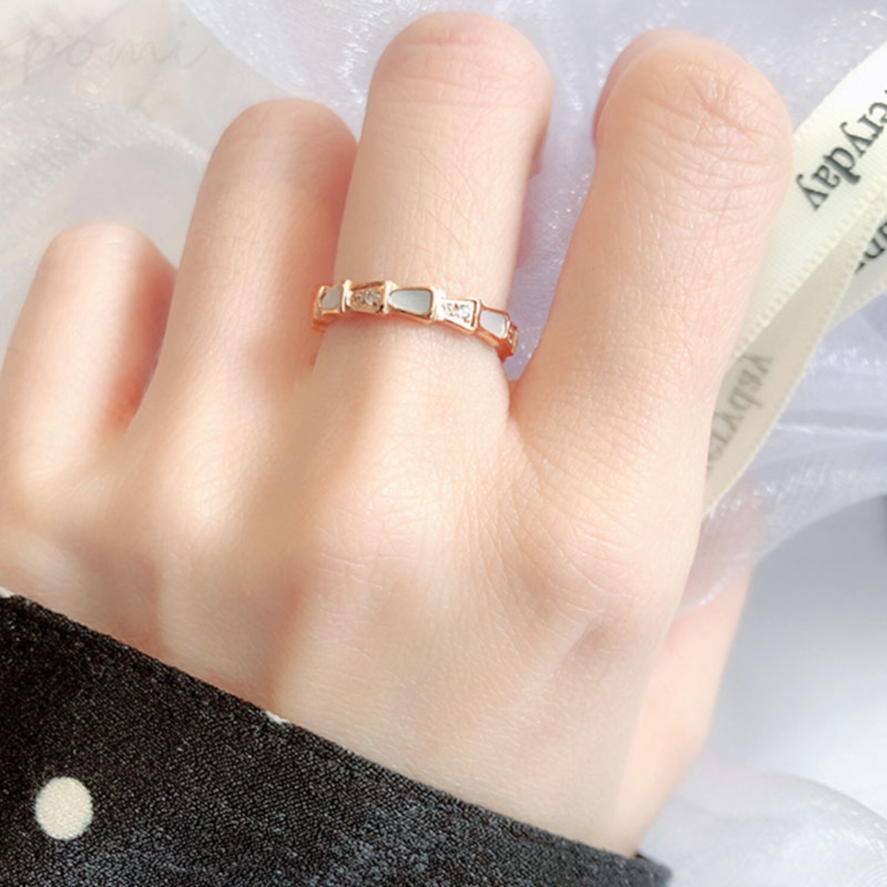 素材選びから製作まで、すべての工程で厳しいチェックを行い、このリングが卓越した品質を持つことを保証します。職人たちは卓越した镶嵌(そうぞう、宝石などを金属に埋め込むこと)技術を駆使して、ホワイトシェルを蛇骨の造形のリング台にしっかりと完璧に镶嵌し、ホワイトシェルと金属を完璧に融合させ、一体感を演出します。金属部分は高品質の合金素材を採用し、多道の工程で磨き上げられ、表面は鏡のように滑らかで、光沢が長持ちします。同時に、合金素材は良好な靭性と耐磨性を持ち、日常の着用でリングが変形したり、損傷したりしにくく、常に新しい状態を保つことができます。