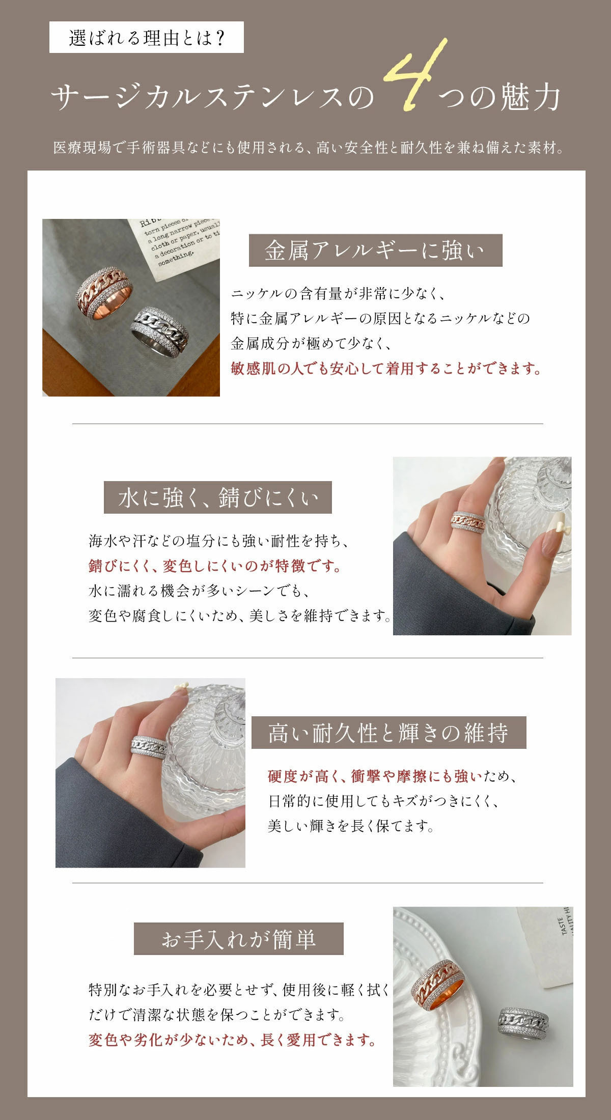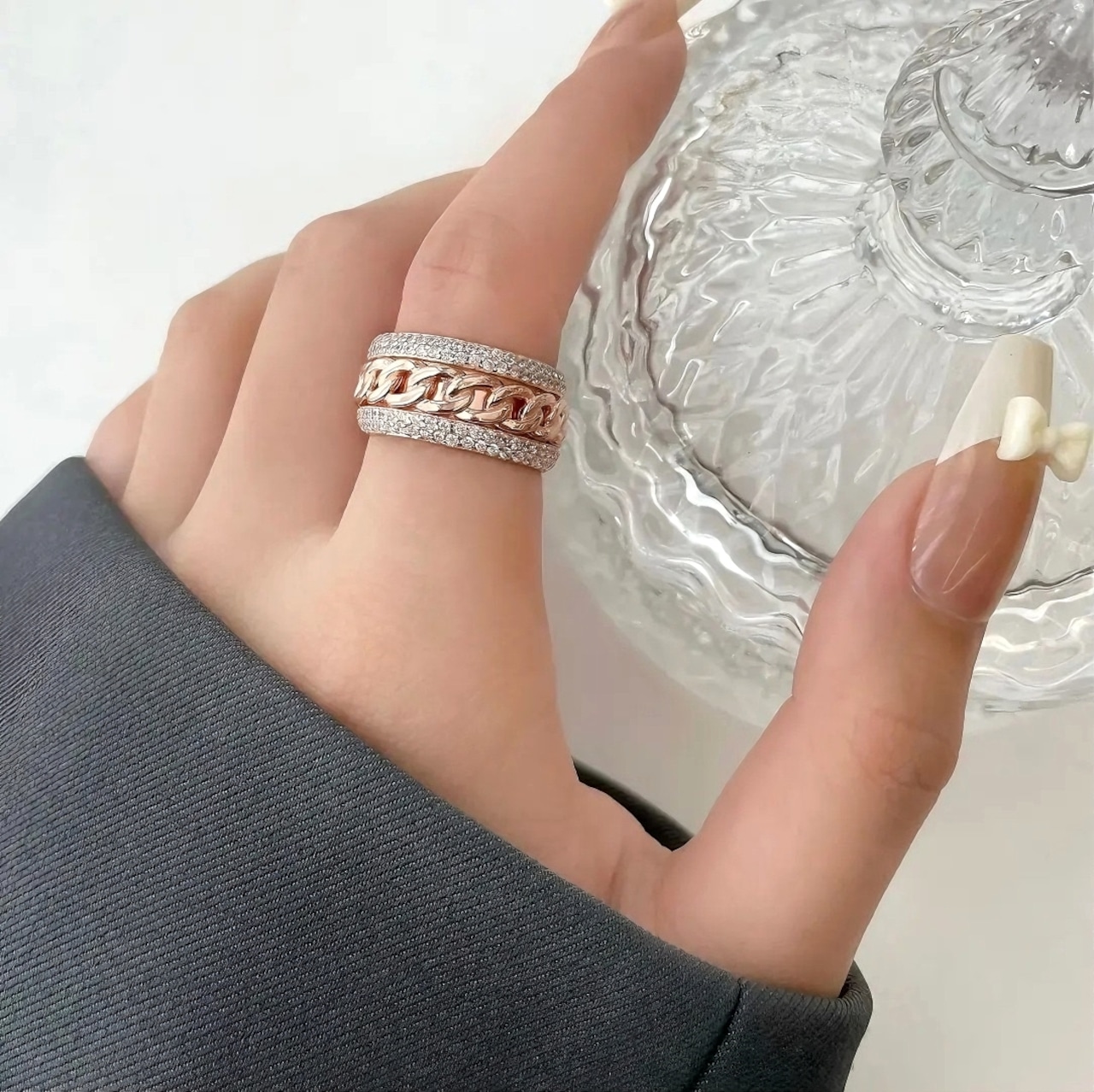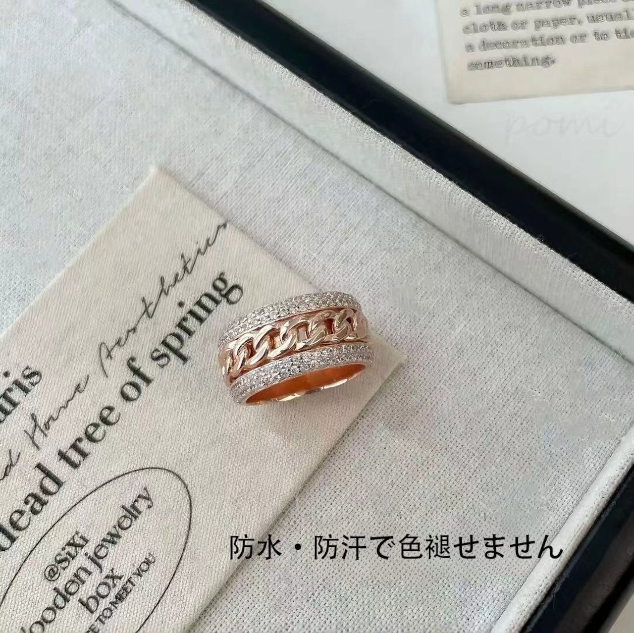 回転可能なキューバンチェーン:リングの本体部分はキューバンチェーンデザインを採用し、チェーン同士が緊密で柔軟に接続されており、自由に回転可能です。この独特なデザインは、リングの趣味性を高めるだけでなく、着用者が手を動かすたびに独特の魅力を放ちます。