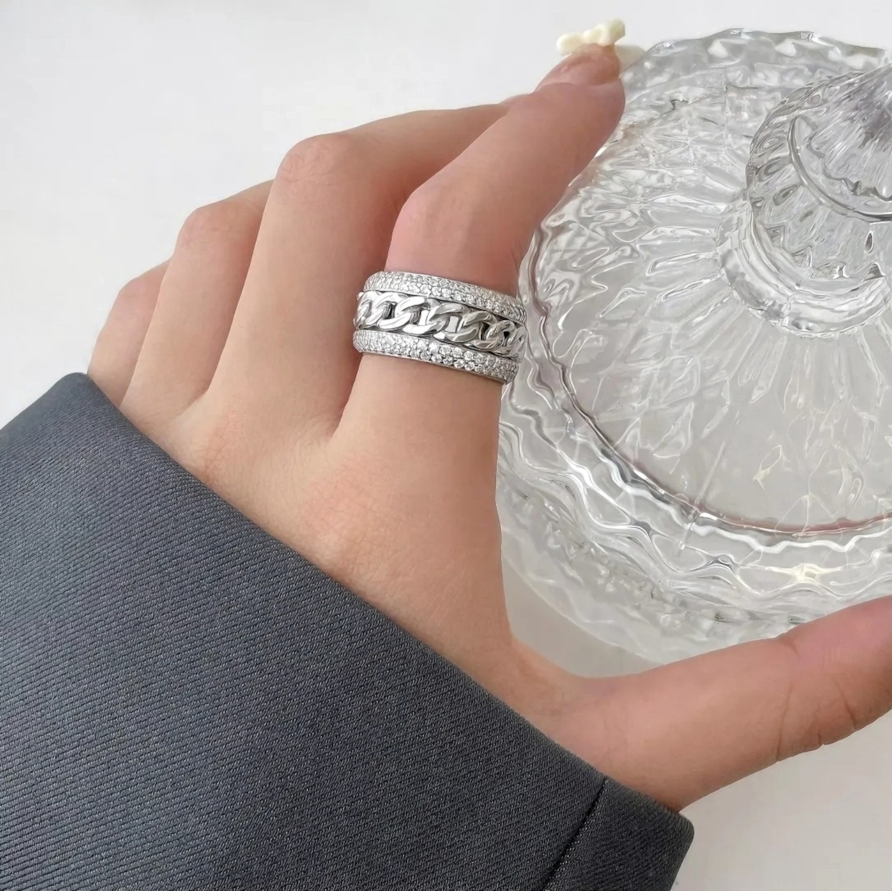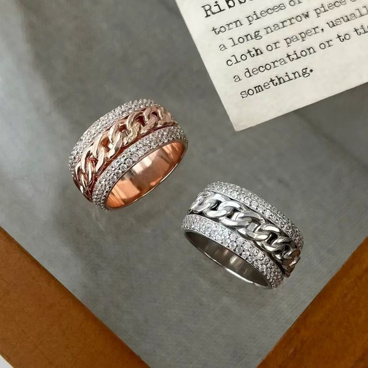 本リングは高品質のS925純銀で丁寧に作られており、ファッションとクラシックの要素を融合させ、独特でクリエイティブなデザインになっています。その最大の特徴は、回転可能なキューバンチェーンデザインで、精巧なマイクロセッティングジルコニアと組み合わせることで、着用者の個性を引き立てるだけでなく、リングにも生き生きとした生命力を与えています。