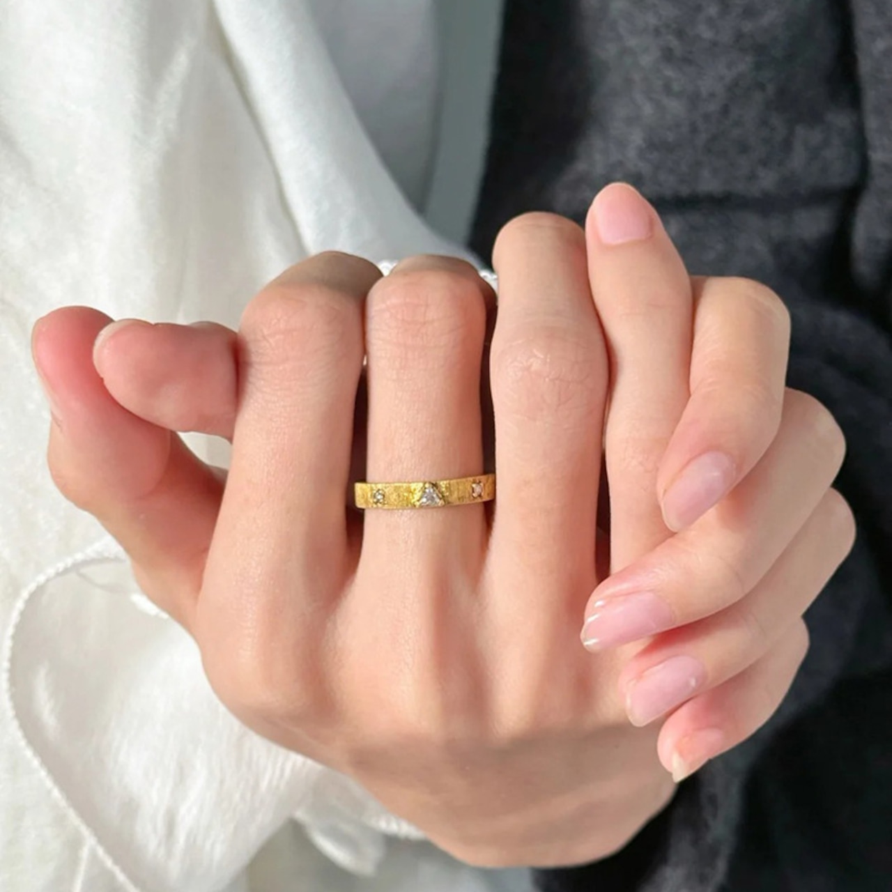 レトロロマンティシズムからインスピレーションを得て、クラシックなヴィンテージ要素と現代の工芸を融合させ、ユニークなカップルの誓いの指輪を作り上げました。ワイヤードラッグ加工の金属表面は、細やかなマットな質感を呈し、愛の中で時が経つにつれて醸し出される優しさを象徴。中央のハート形の透かし彫りデザインは、「心と心が通じ合う」を意味し、光と影の間で甘い絆を感じさせます。
