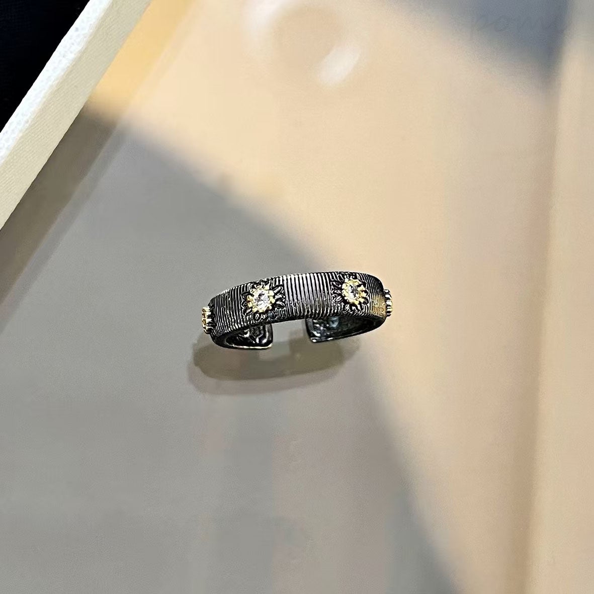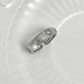 開き幅が調節可能な、織り紋雕金技法で手作業ラッシング加工を施した、デュアルカラーゴールドのヴィンテージスタイル・マイクロペーヴェ微細石嵌満嵌リング