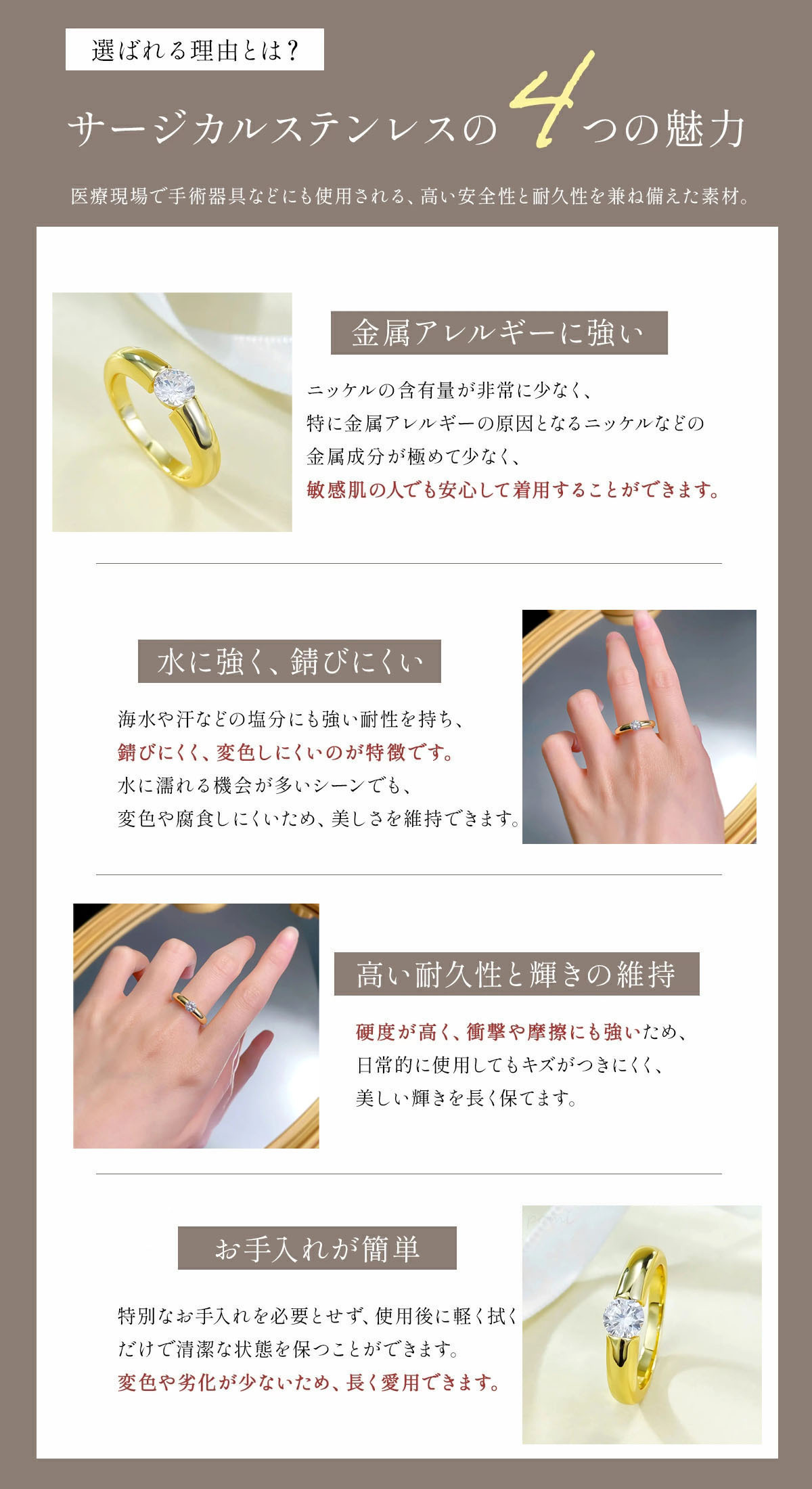 化粧や香水を使用した後に身に着けることで、化学物質による金属の腐食を減らします。