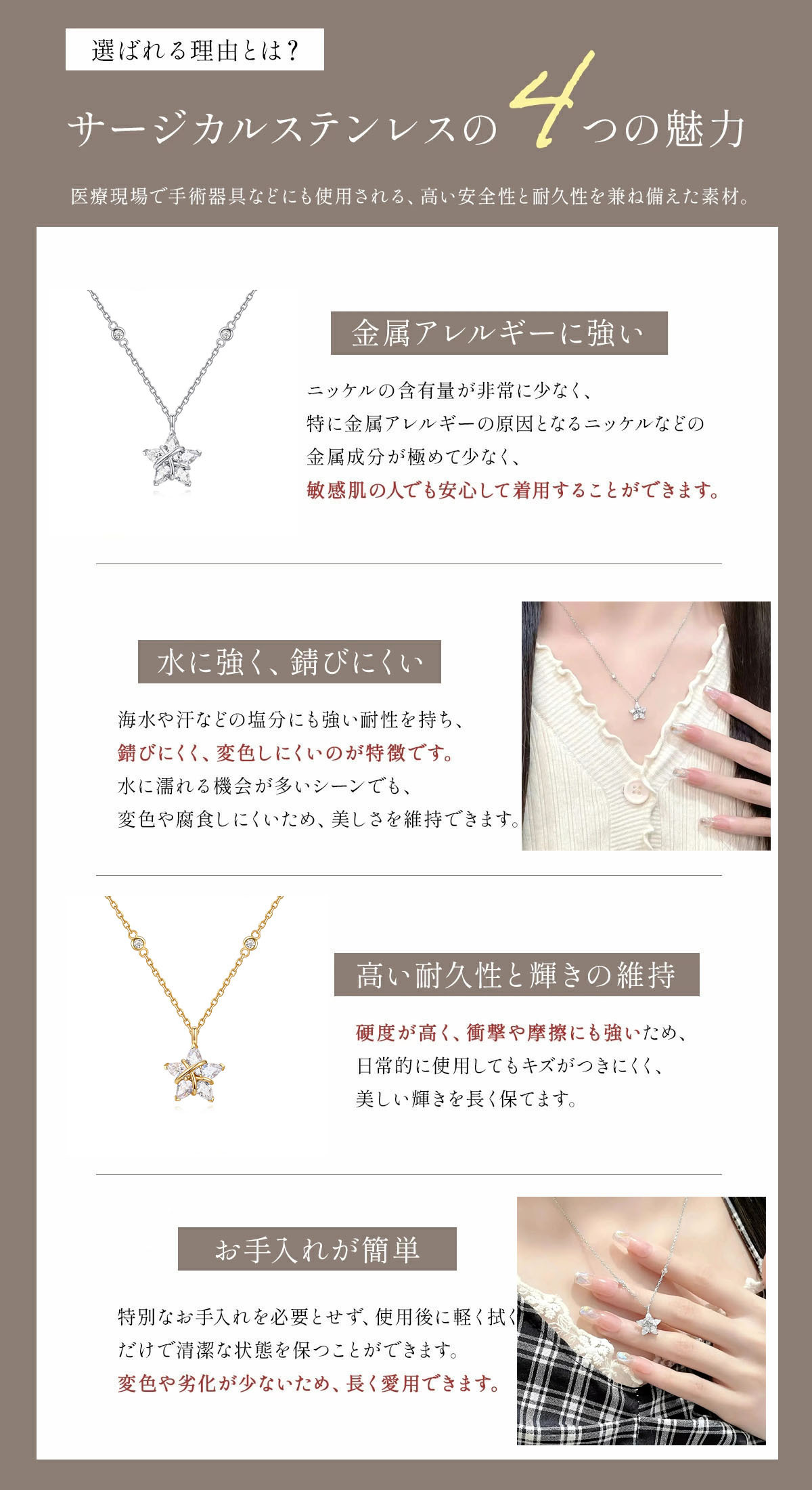 チェーンデザイン:細いチェーンに星のペンダントを合わせ、軽やかで可憐な印象。日常のレイヤードスタイルや単体での装着にも最適です。