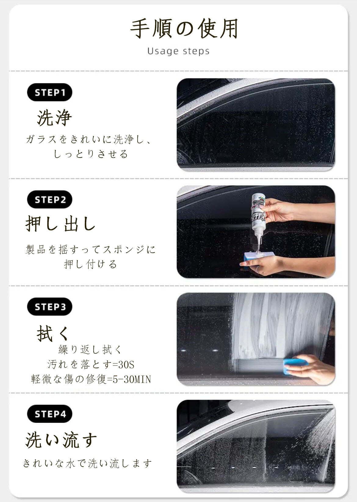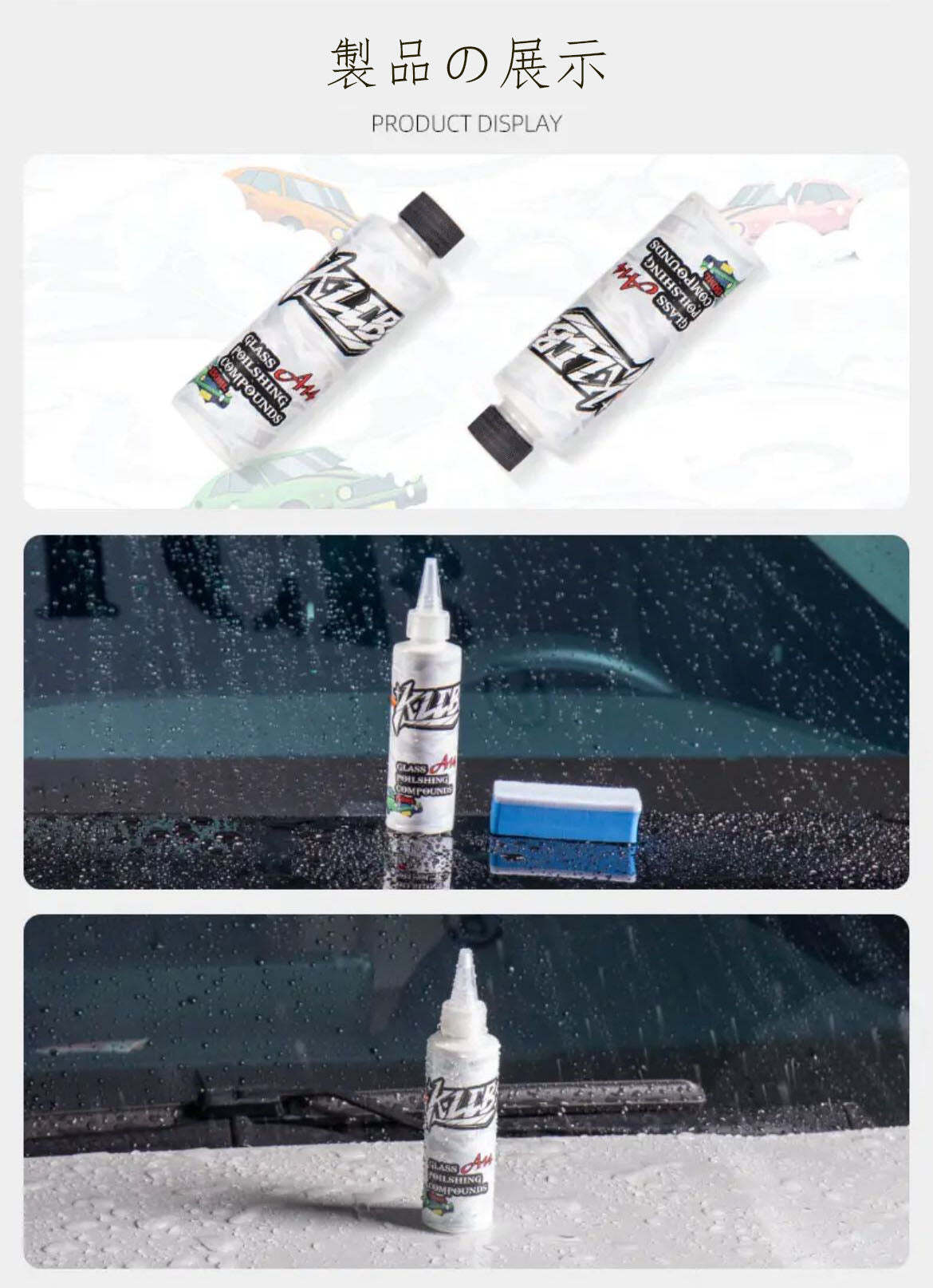【油膜除去】研磨液は強力な油膜除去効果を発揮し、長期にわたって蓄積された油膜を完全に除去します。これにより、ガラスの透過性と視界の明瞭度が大幅に向上し、運転時の安全性が確保されます。