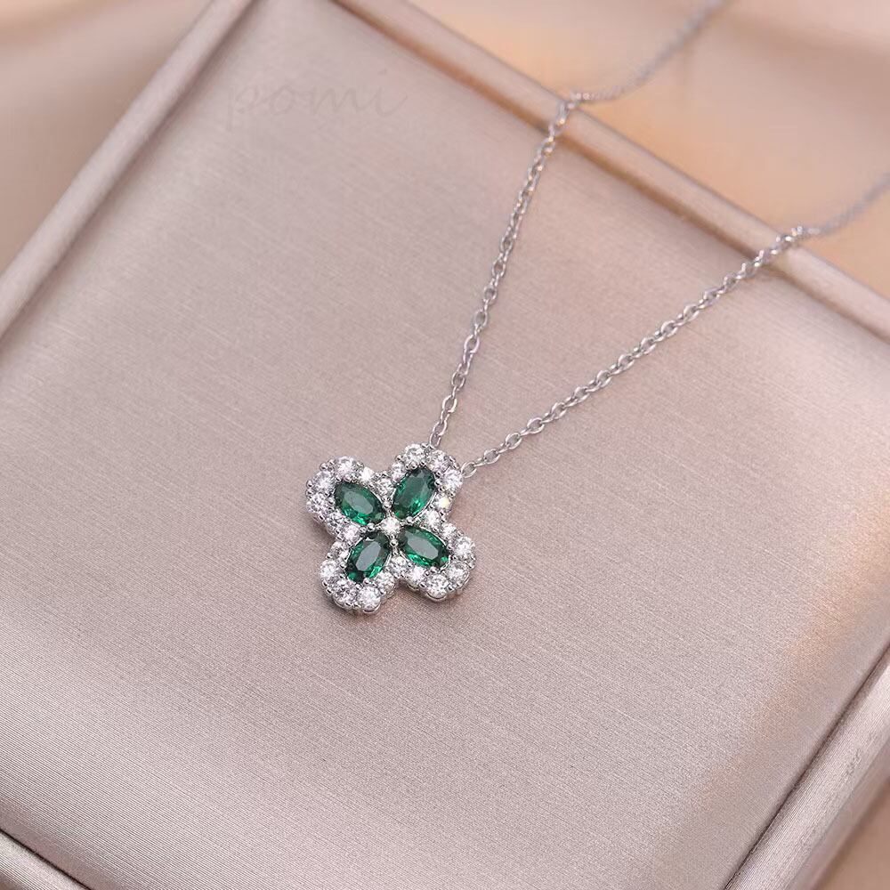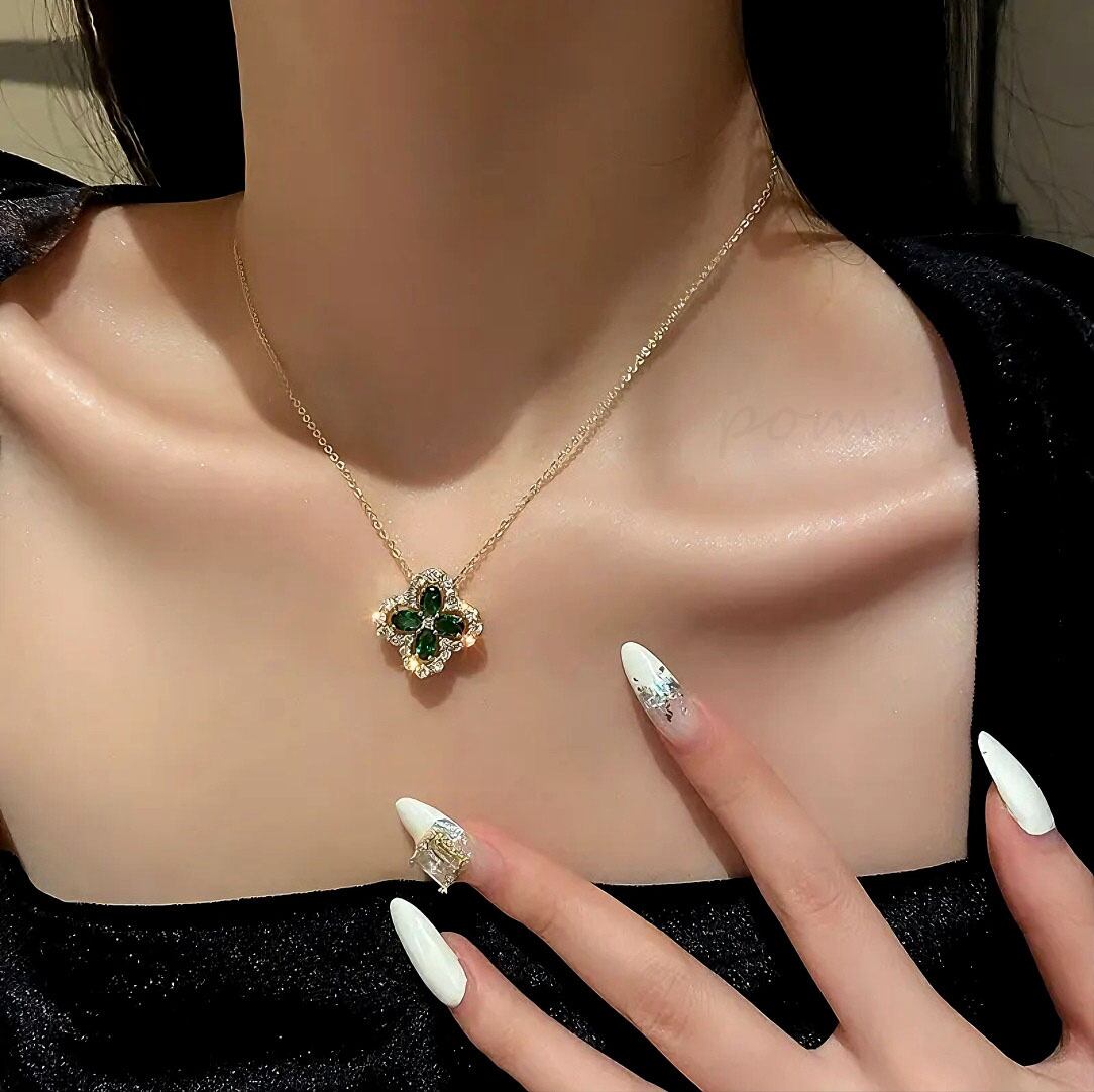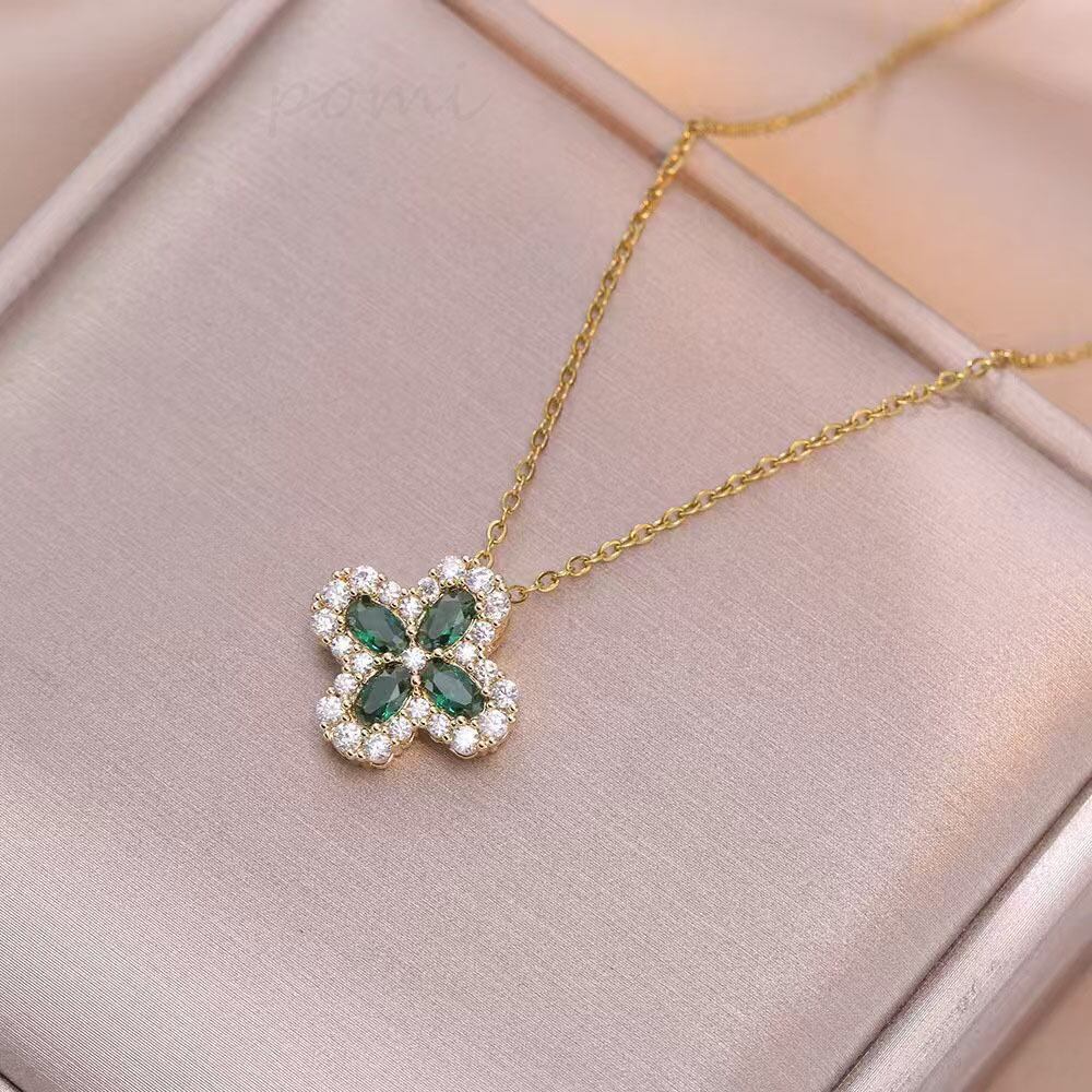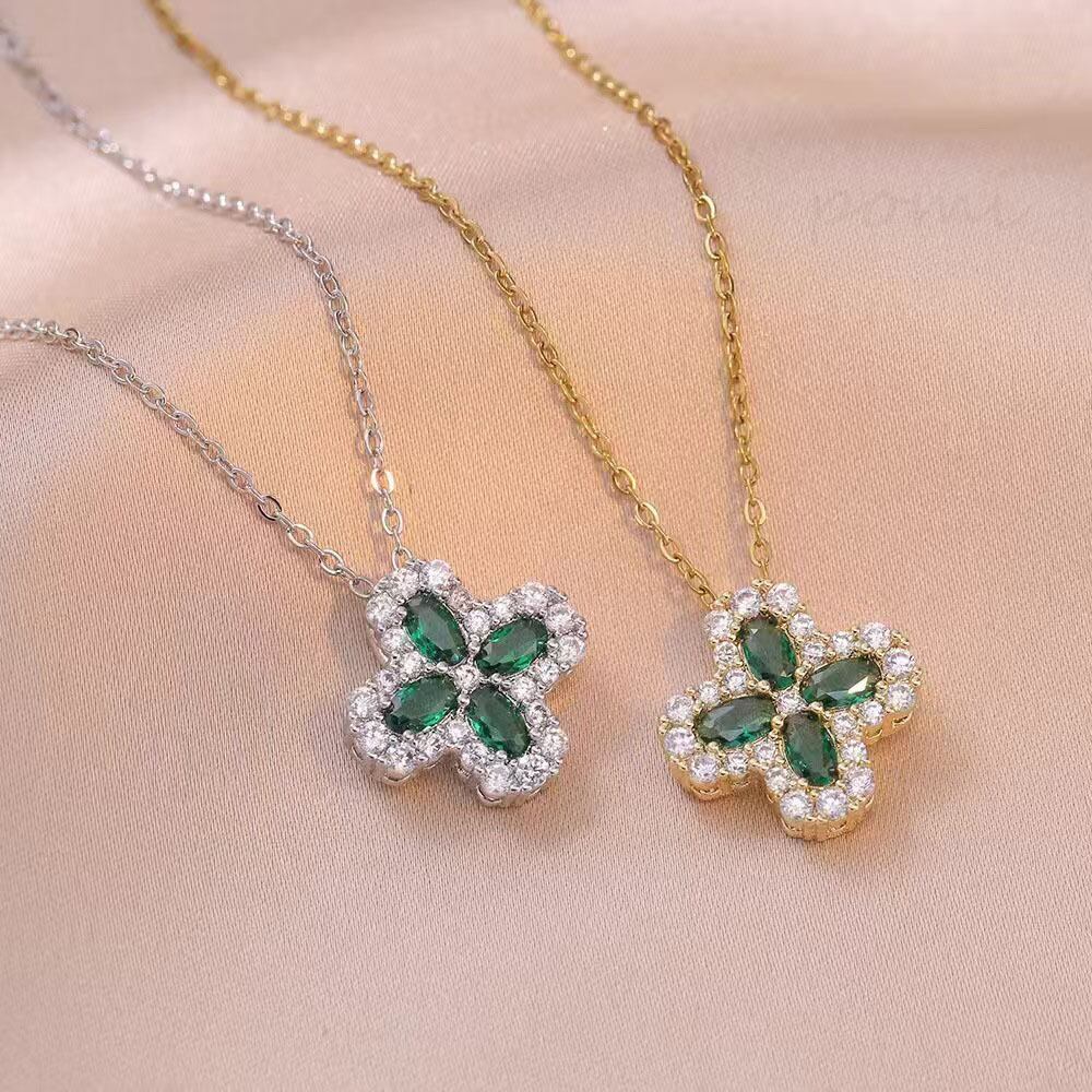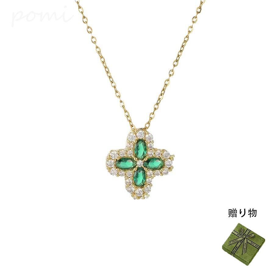 シンプルなゴールドメッキエメラルド四葉クローバーペンダントネックレス