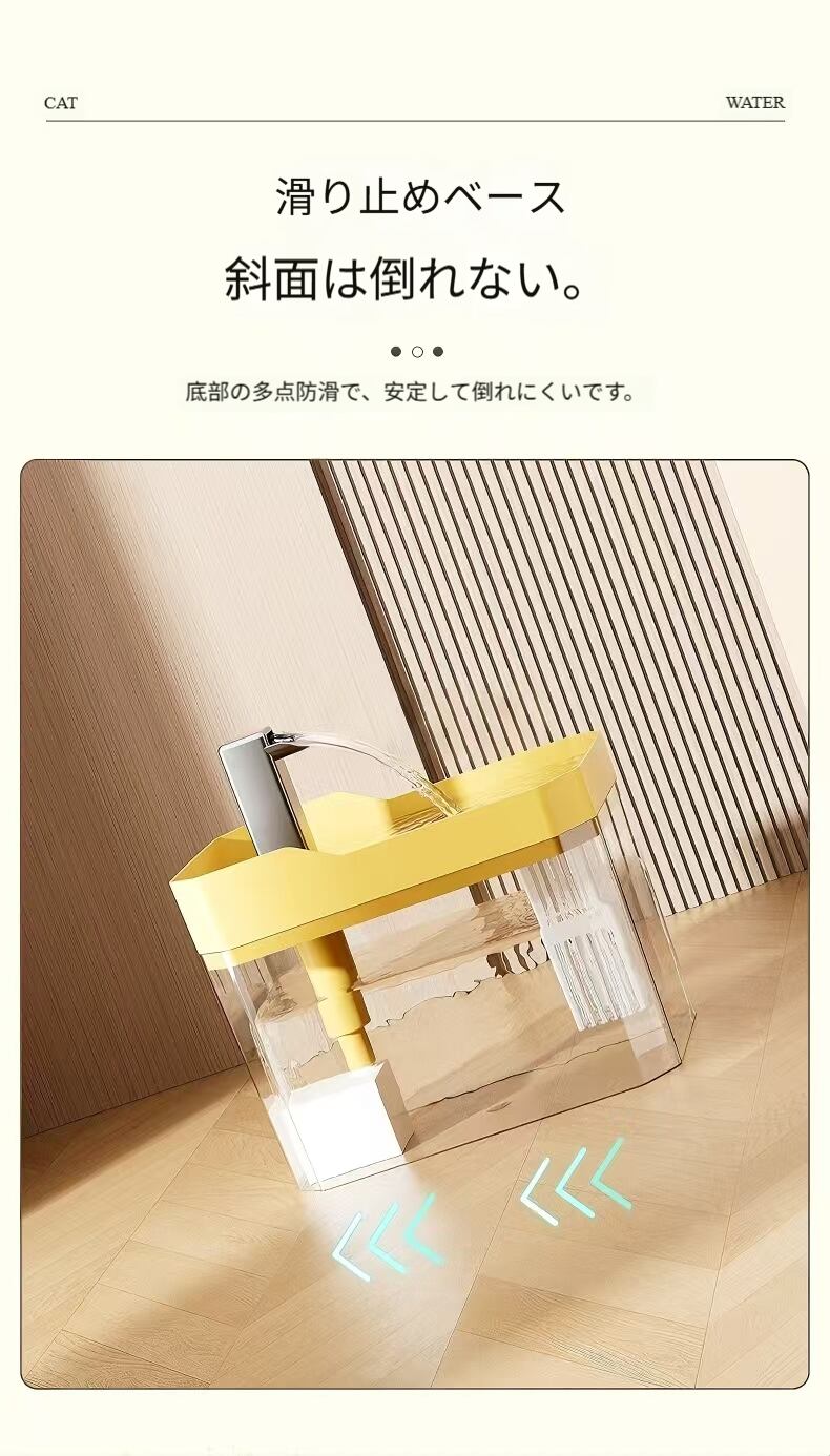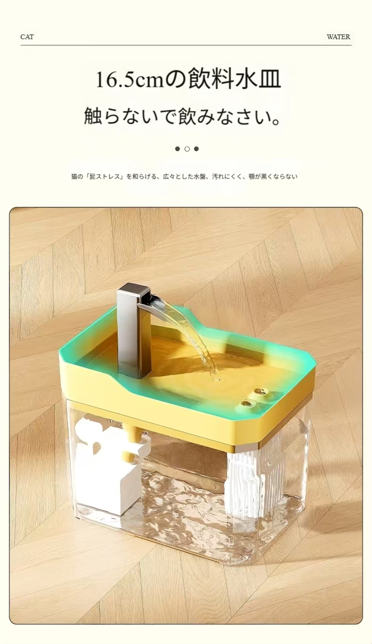 このウォーターディスペンサーは、独特の口周り濡れない設計を採用し、精心に設計された出水口と水流の方向により、ペットが水を飲む際に水が口の中に正確に流れ込み、口の周りに飛び散らないようにしています。