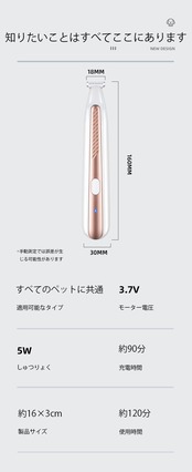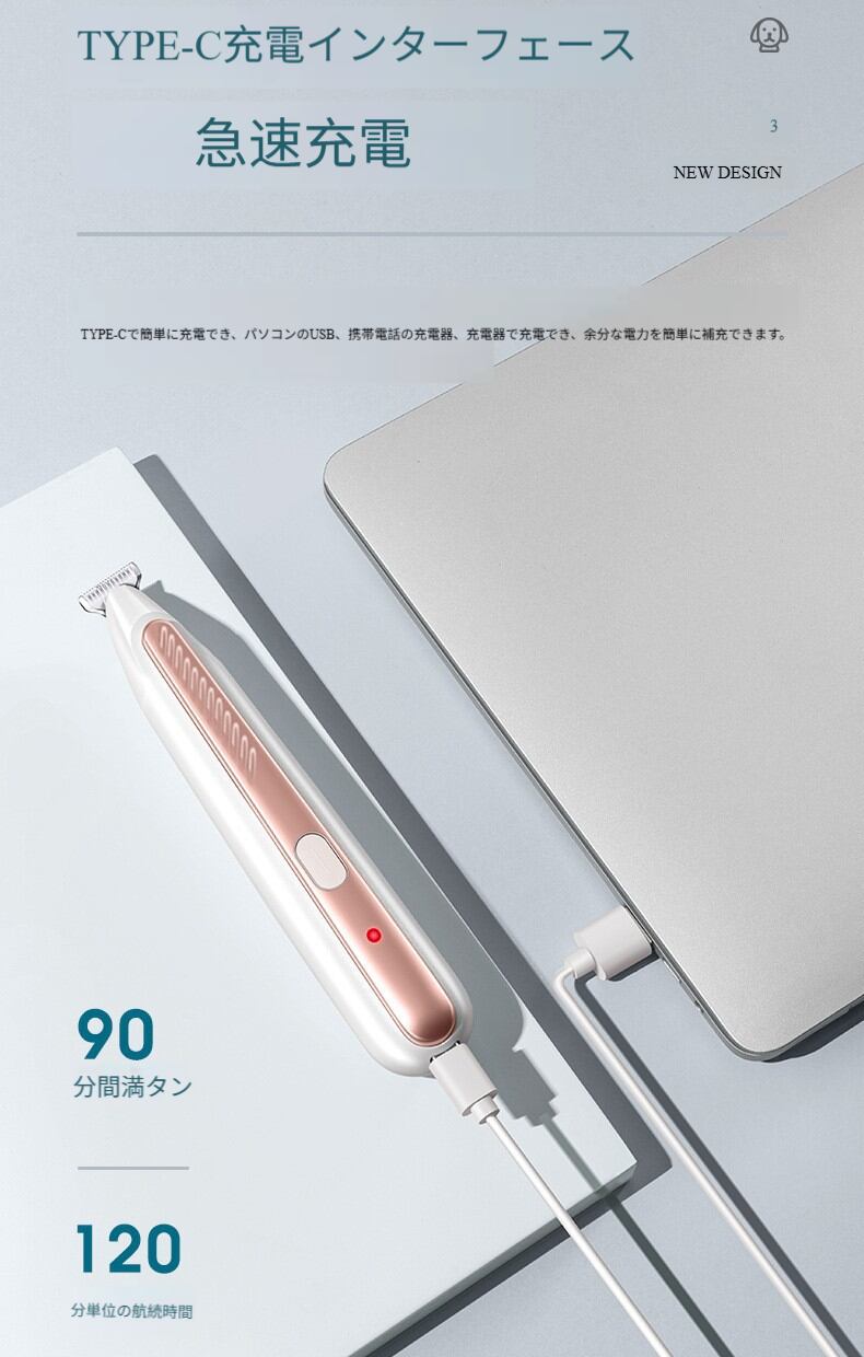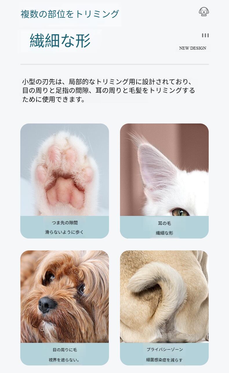 このペット用トリマーは、ペットの部分毛のトリミング専用に設計されており、顔の周り、耳の後ろ、足の甲の周辺などの細かい部位はもちろん、体の特別にトリミングが必要なエリアでも、正確に操作できます。