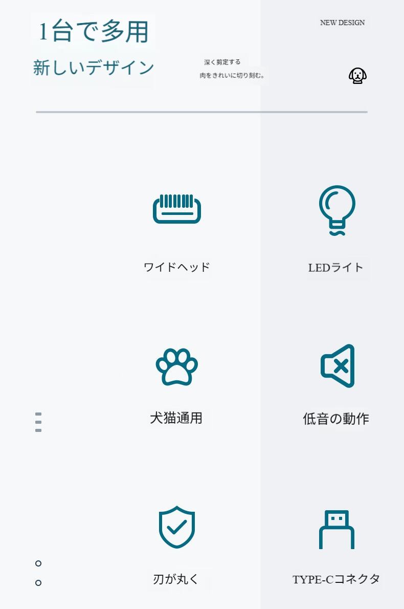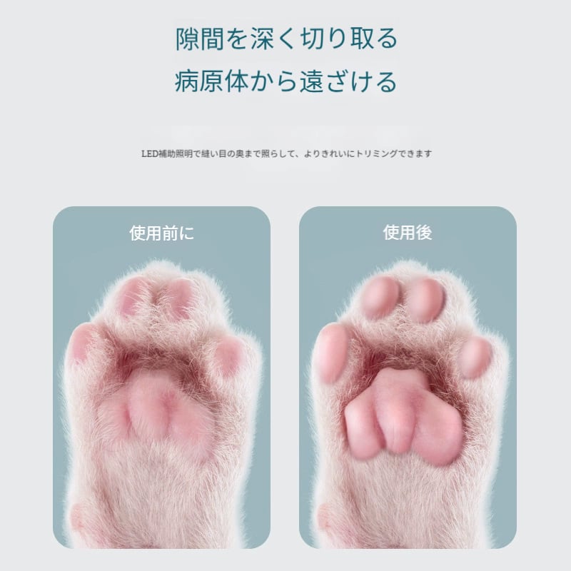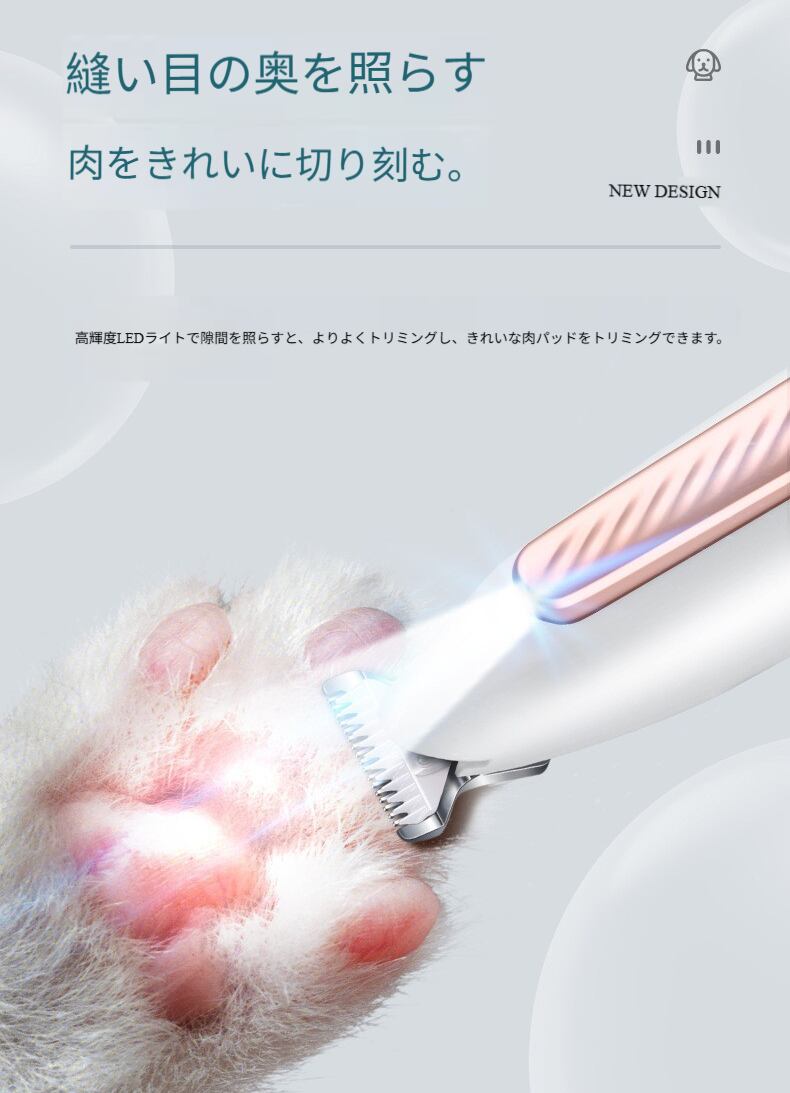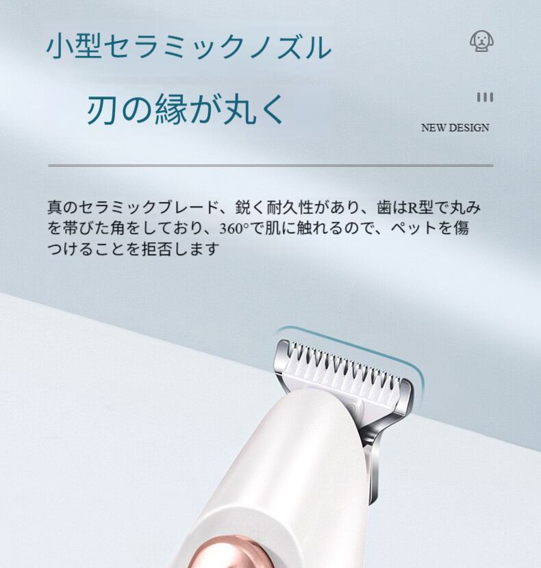 このトリマーは安全で丸みを帯びた刃先設計を採用し、縁が滑らかで鋭角がないため、トリミング中にペットの肌を傷つけるのを有効に避けます。