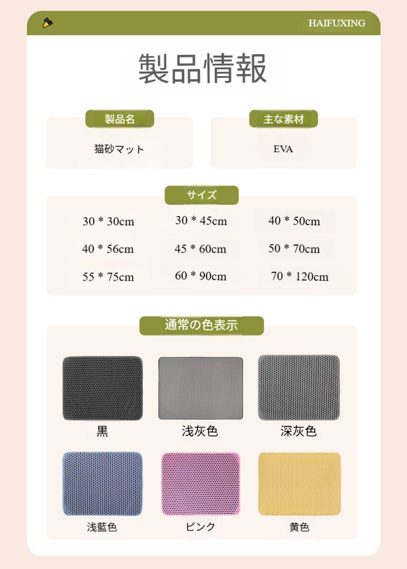 この猫砂マットには複数のカラーが選べるので、愛猫が快適なトイレタイムを楽しむとともに、ご自宅のインテリアに温かみと趣きを添えることができます。