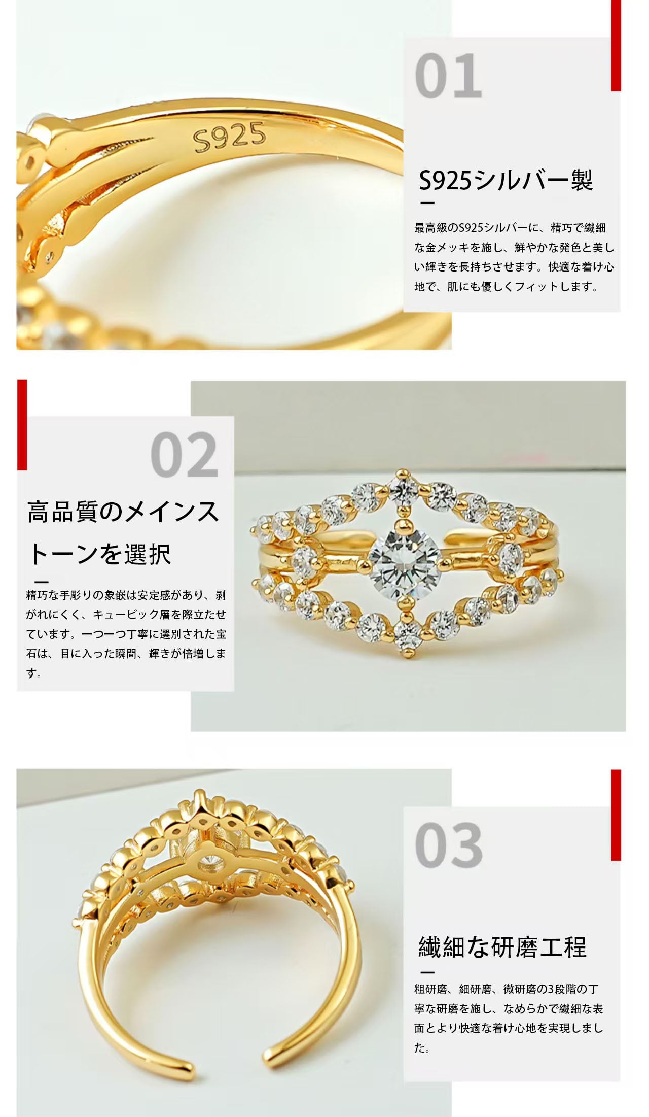 リングベース:国際規格の925シルバー素材を使用し、三重メッキ・ポリッシュ処理を施すことで、アレルギー防止と色褪せ防止を実現。長く着用しても新しい輝きを保ちます。