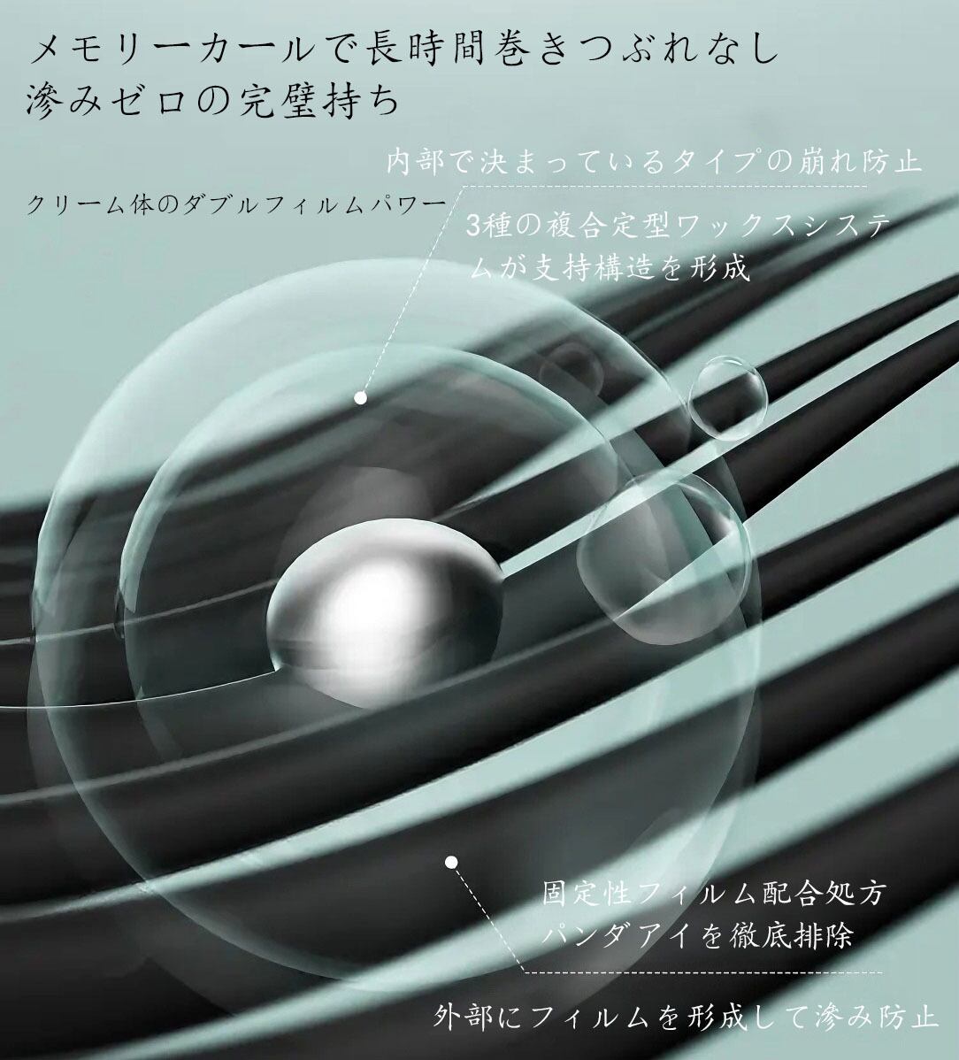 ミクロン級天然繊維が網状に織り成す構造で、まつげを瞬時に3mm延長。まつげのすき間を埋め、「無から有」の長さアップ効果を実現。