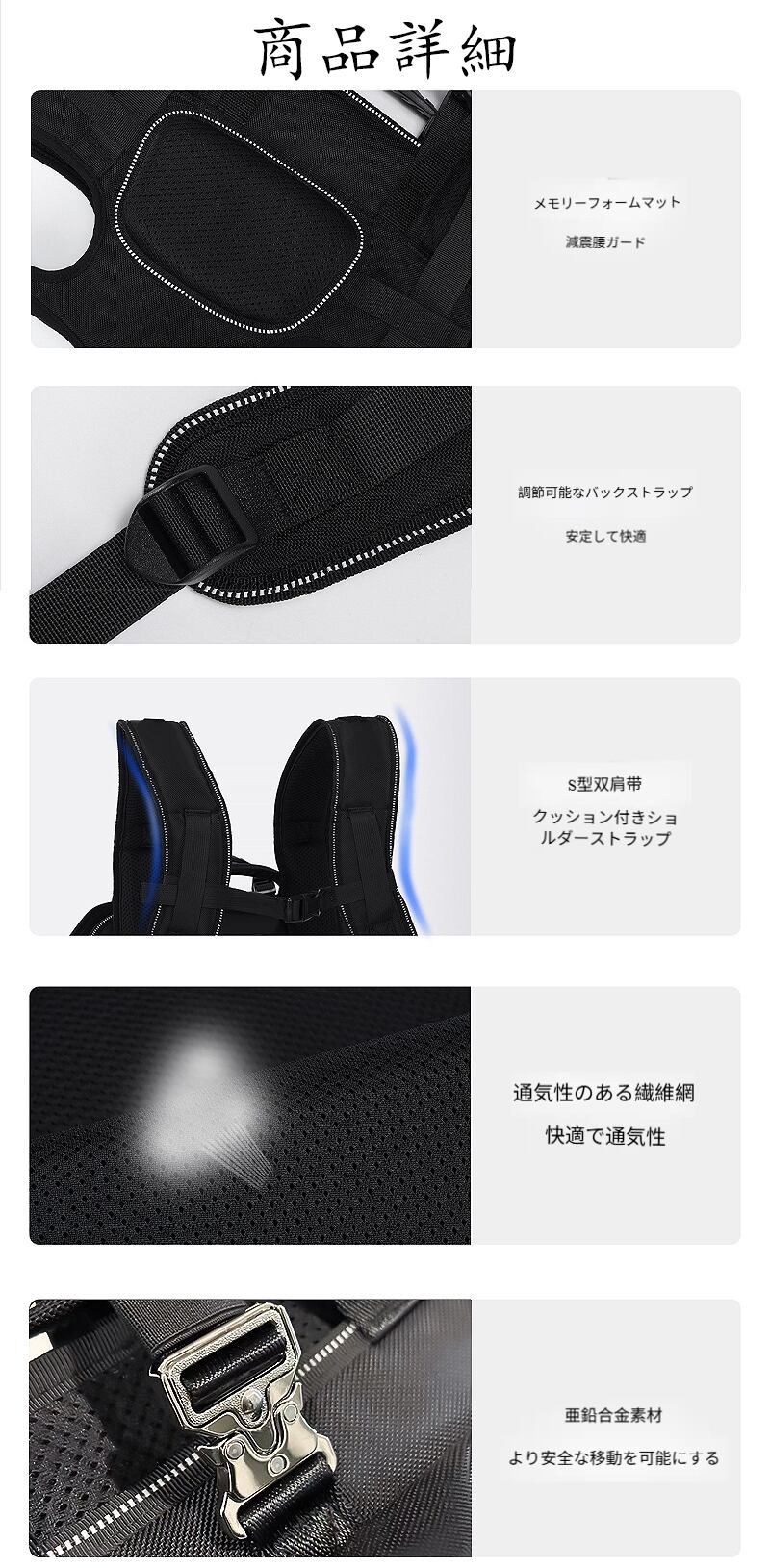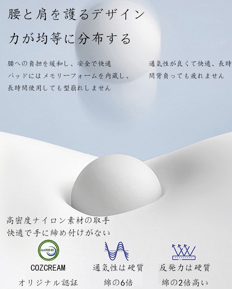 バッグの肩紐と背負い部分はすべて人間工学の設計を採用し、人体の曲線にフィットし、背負う圧力を軽減します。