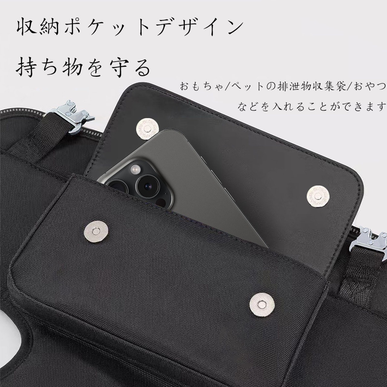 バッグ本体には複数の実用的な収納ポケットが設計されており、ペットの食べ物、水筒、引き綱、おもちゃなどの物品を便利に収納できます。