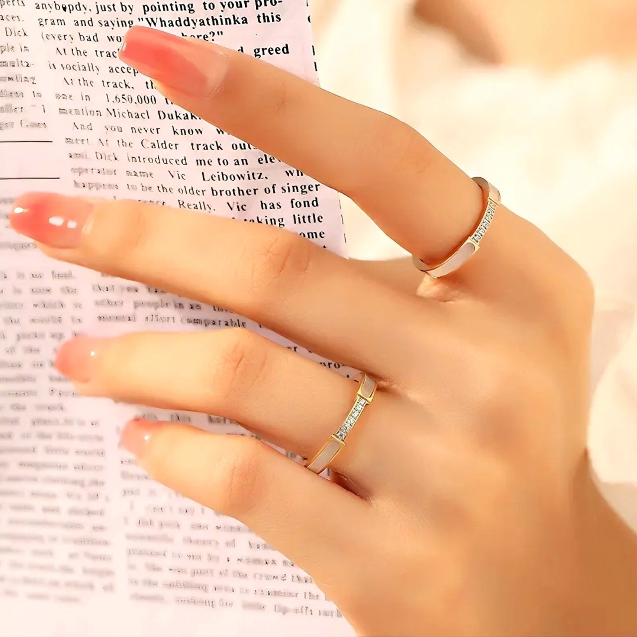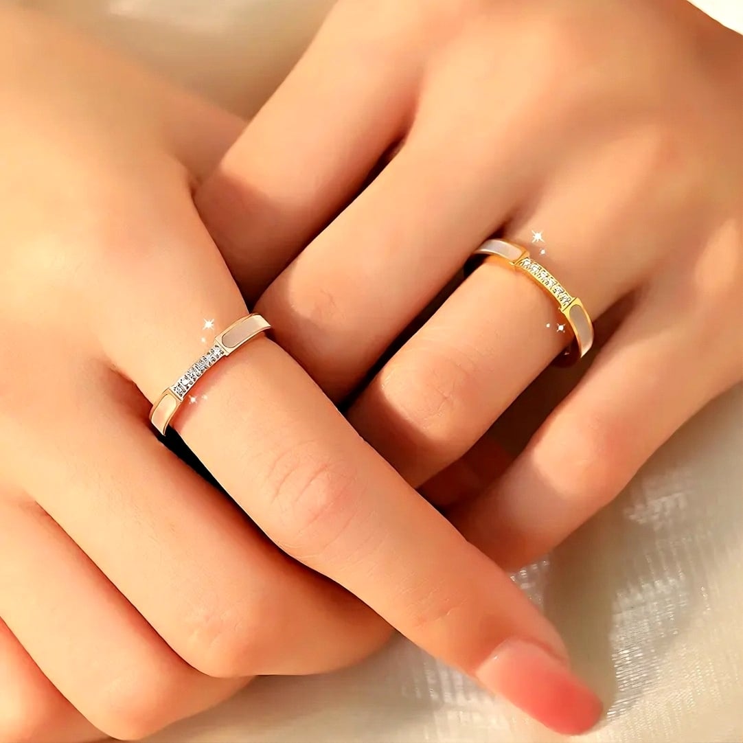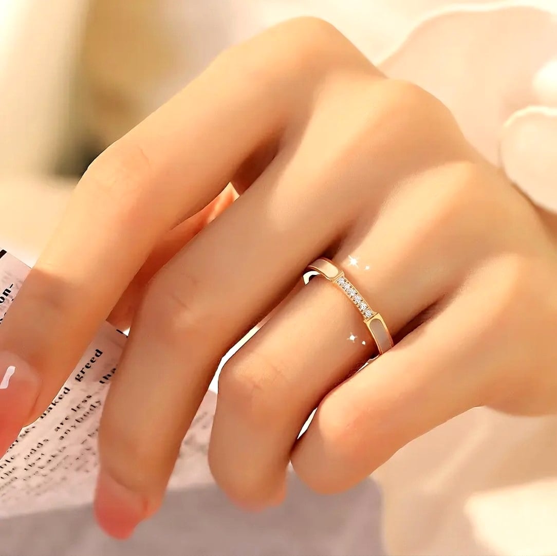 六ダイヤモンド入りマザーオブパールリング、チタンスティールとスモールダイヤモンド、ニッチなファッション感、通勤向け、軽いラグジュアリー感、高級感のあるレディースリング
