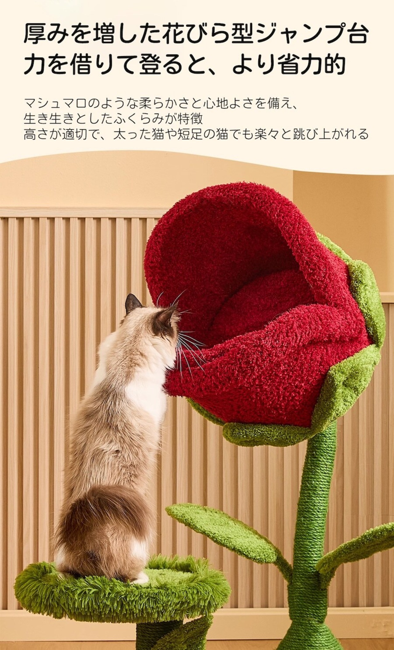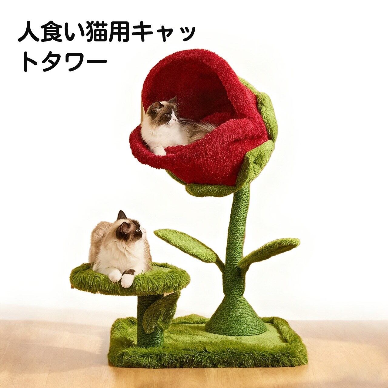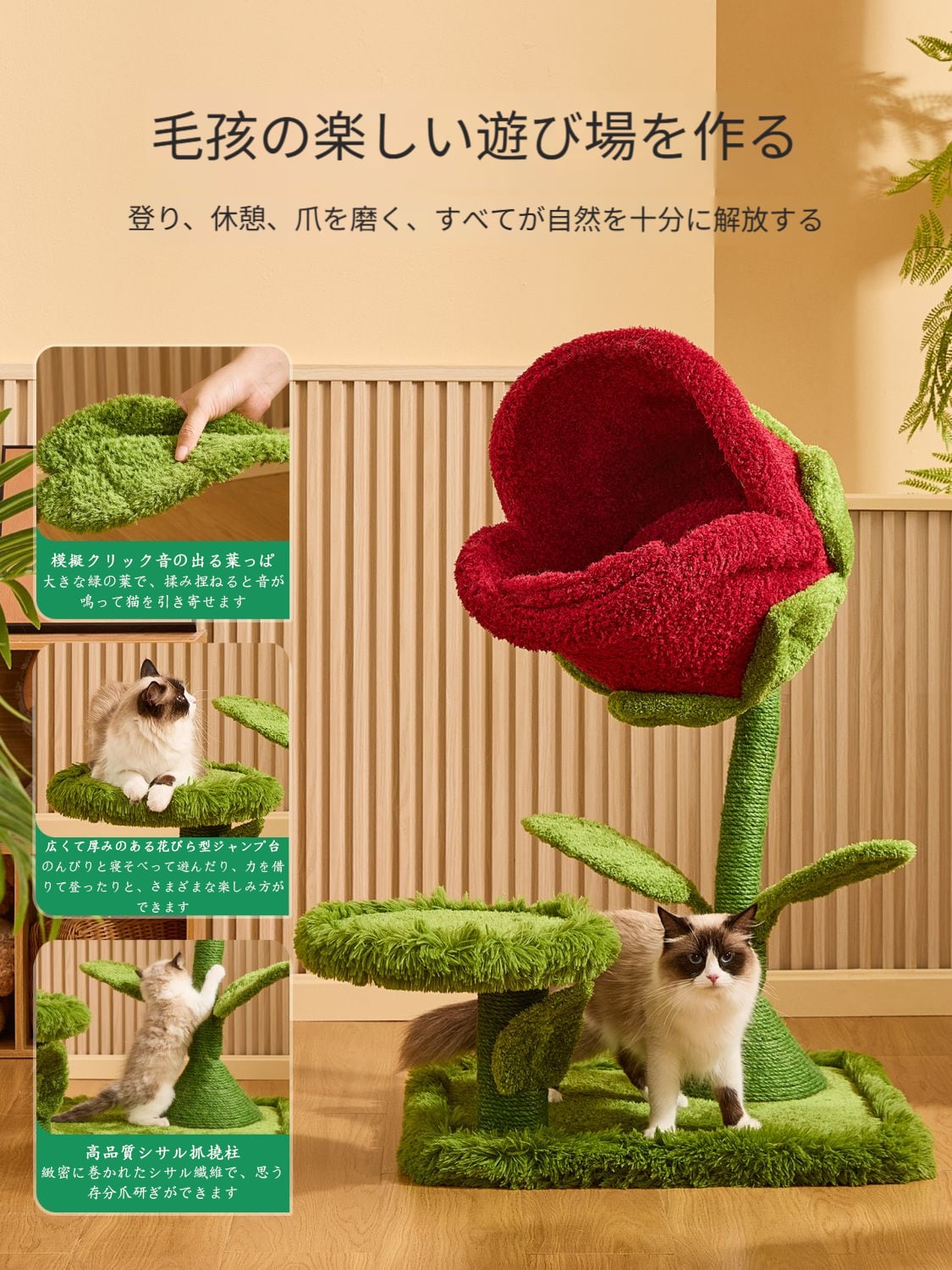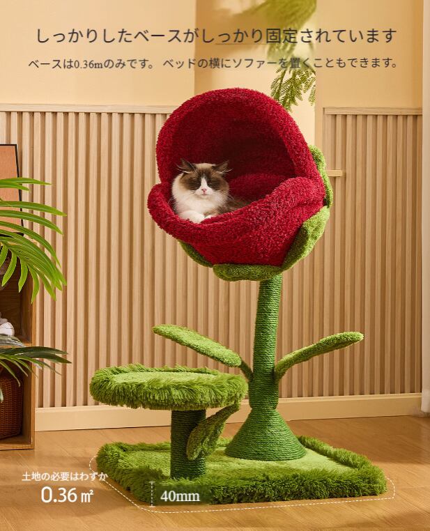花弁プラットフォームで登高、ツタの麻ロープで爪研ぎ、ソフトパッドで休息でき、複数のペット用品を買う必要なし。