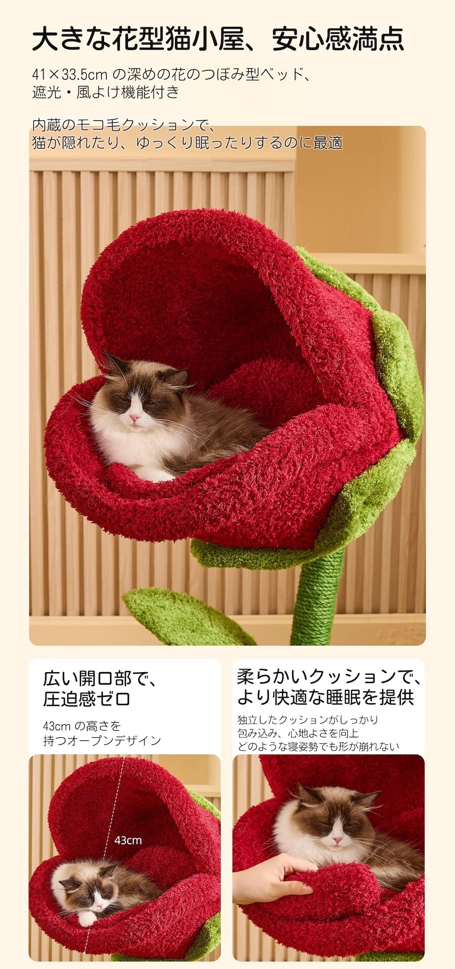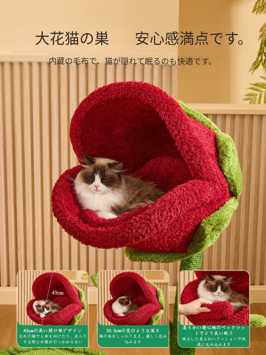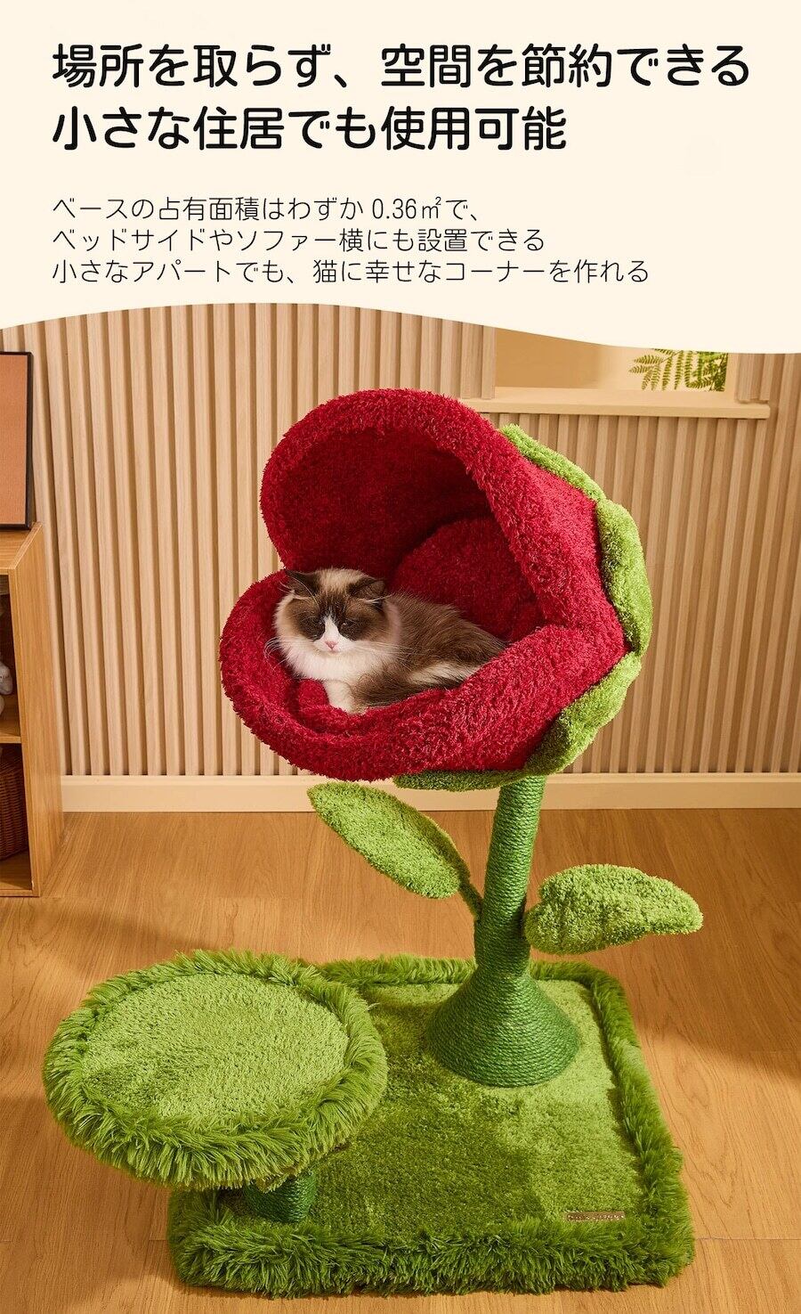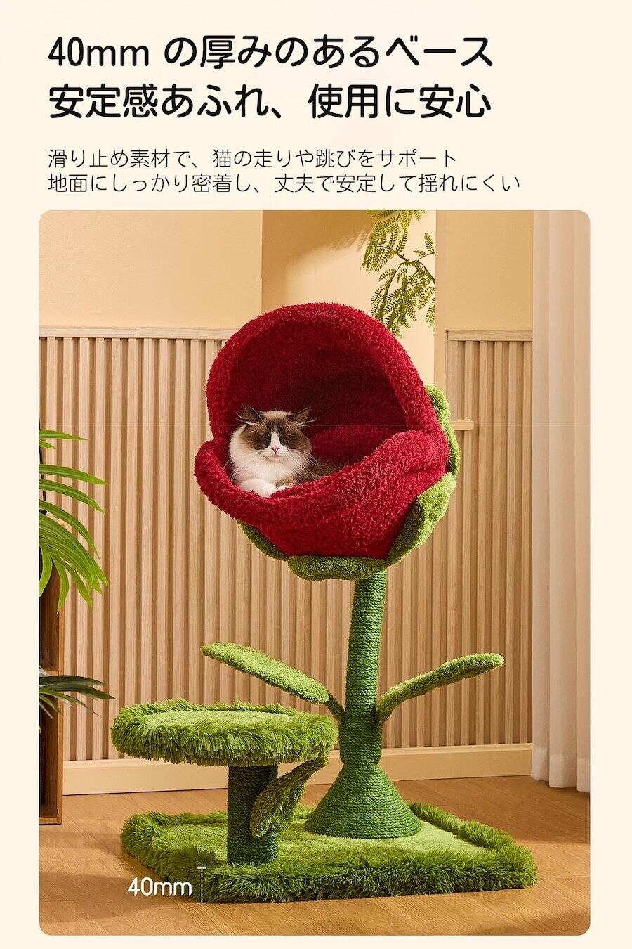 花弁プラットフォームで登高、ツタの麻ロープで爪研ぎ、ソフトパッドで休息でき、複数のペット用品を買う必要なし。