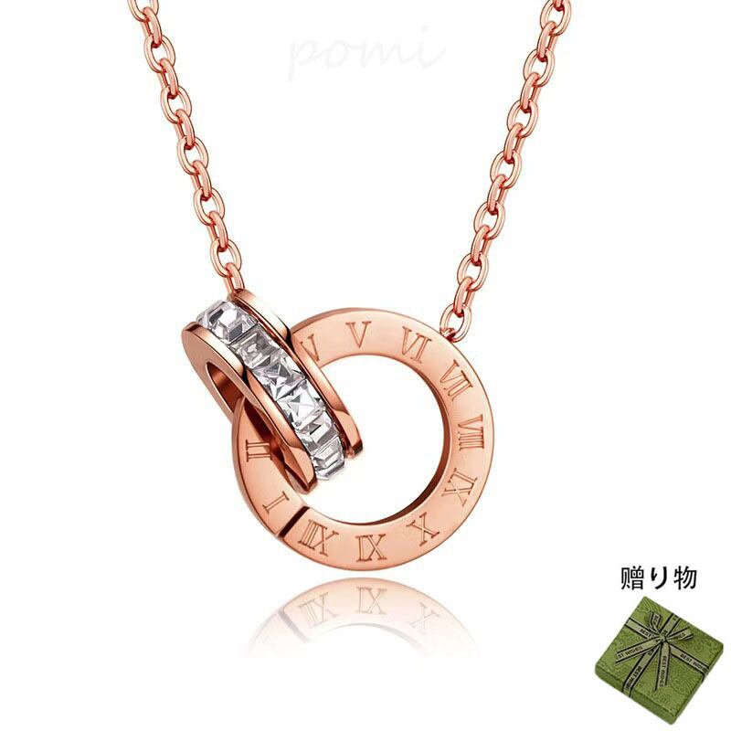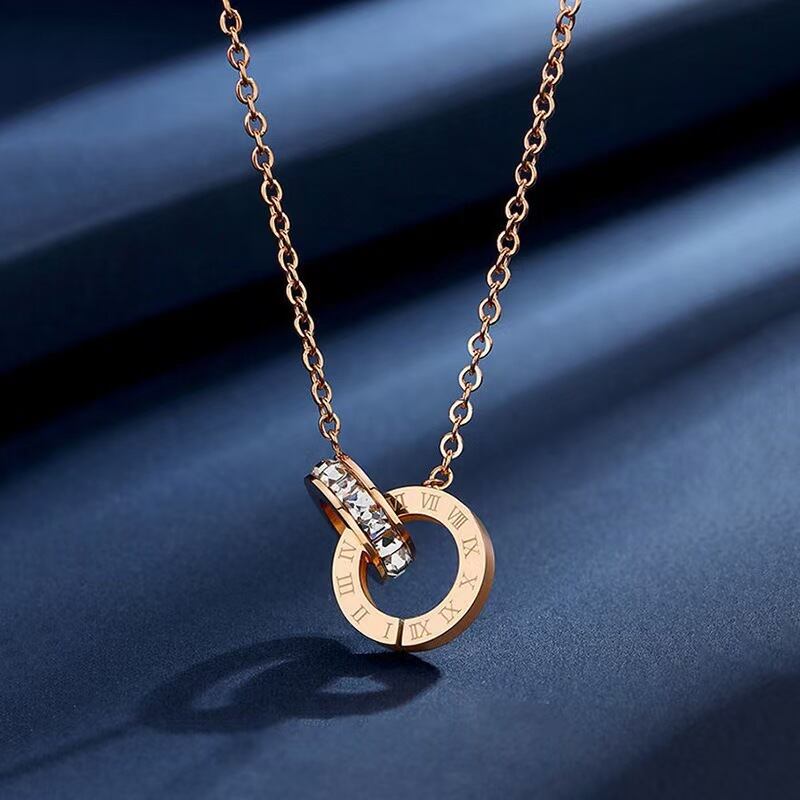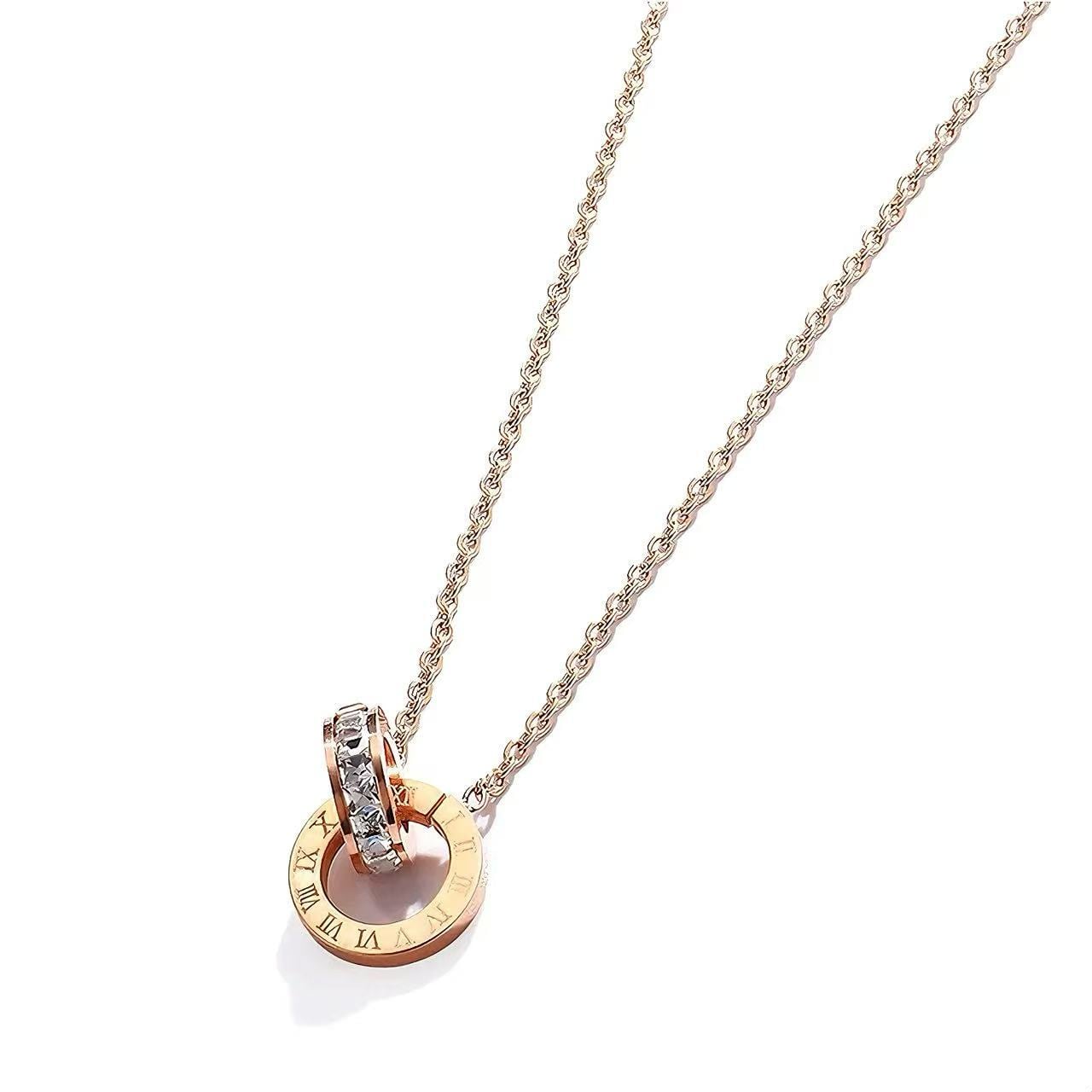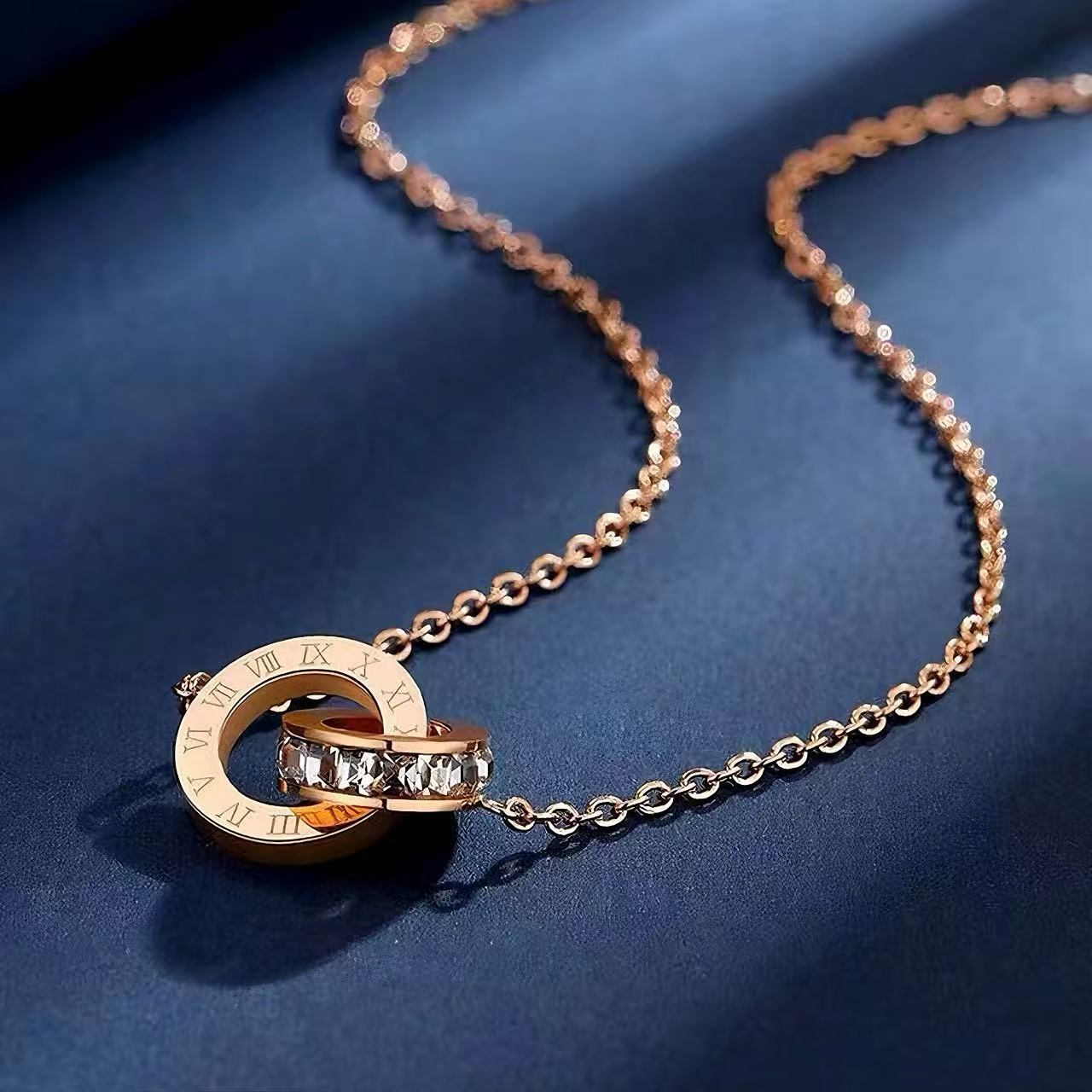 チタンスチール ローマ風ダブルリング ダイヤ風ジルコニアセット ネックレス オールマイティでおしゃれ、色褪せしないペンダント