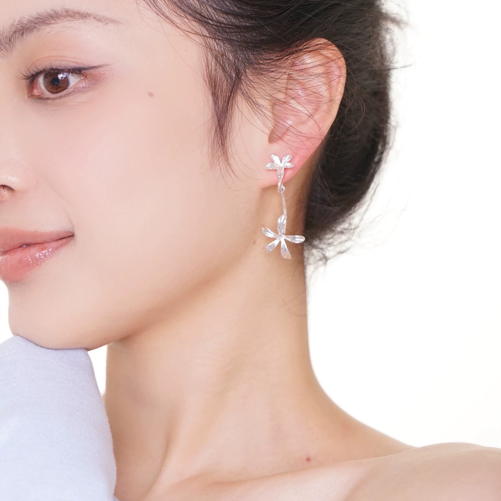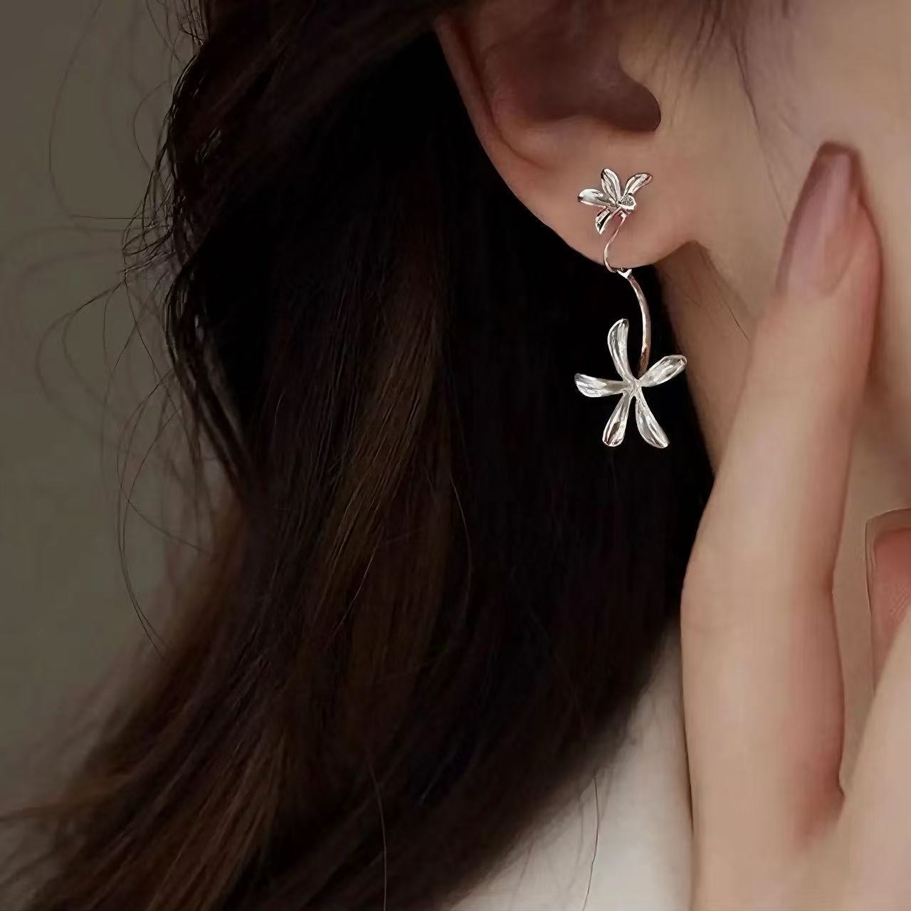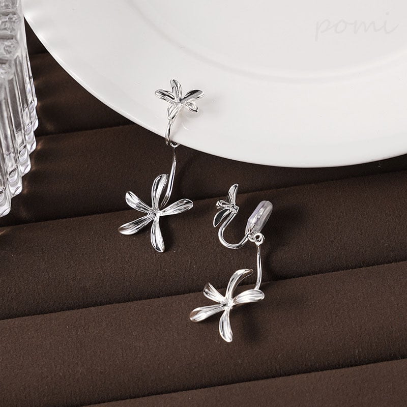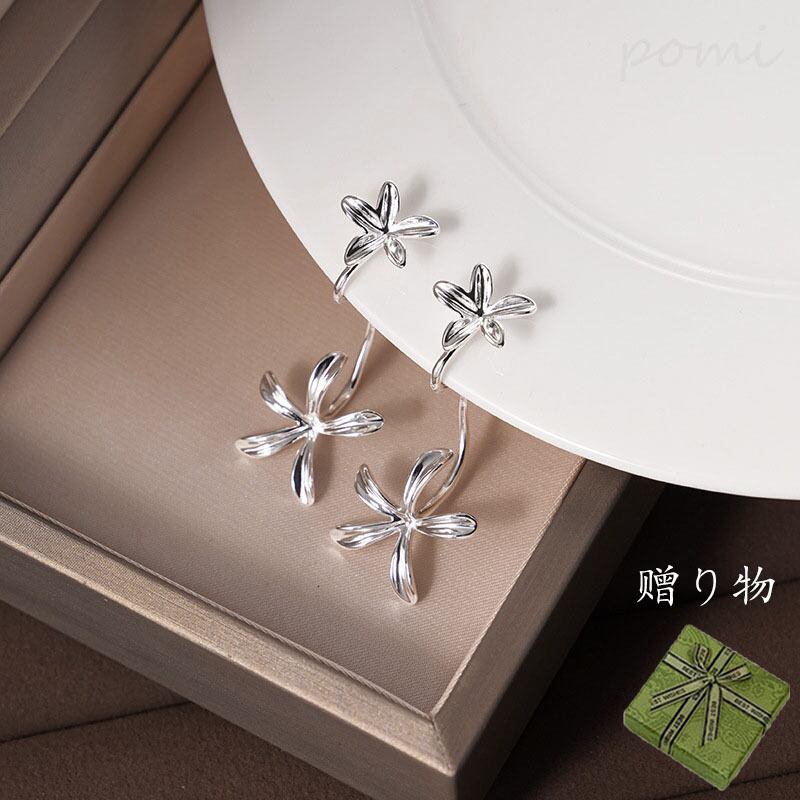 クチナシの花をモチーフにした銅合金イヤリング、清冷感溢れる高級な雰囲気のバックハングタイプのイヤーアクセサリー