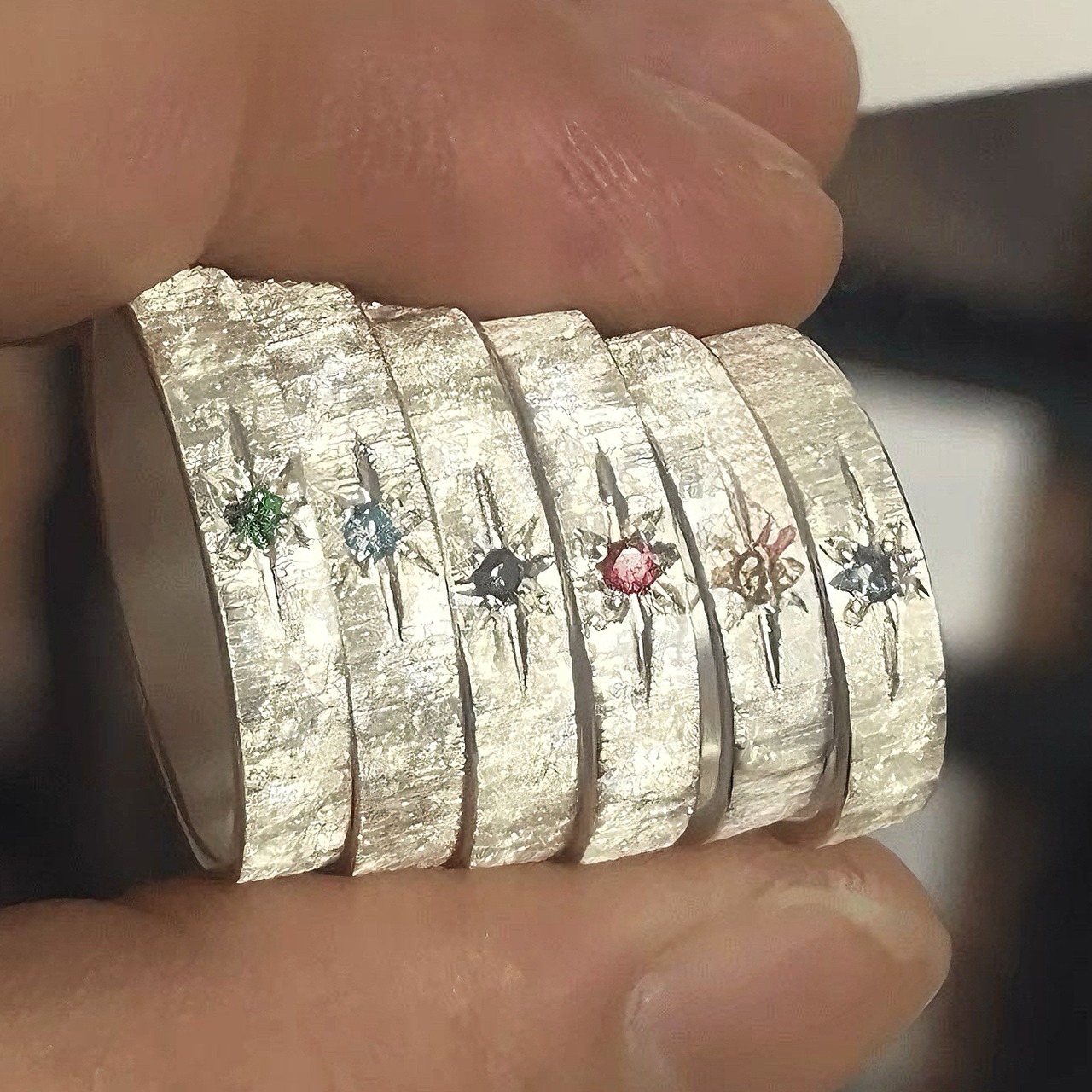 リング本体には星芒の要素を巧みに取り入れ、精湛な技術で輝くジルコニアを埋め込んでいます。