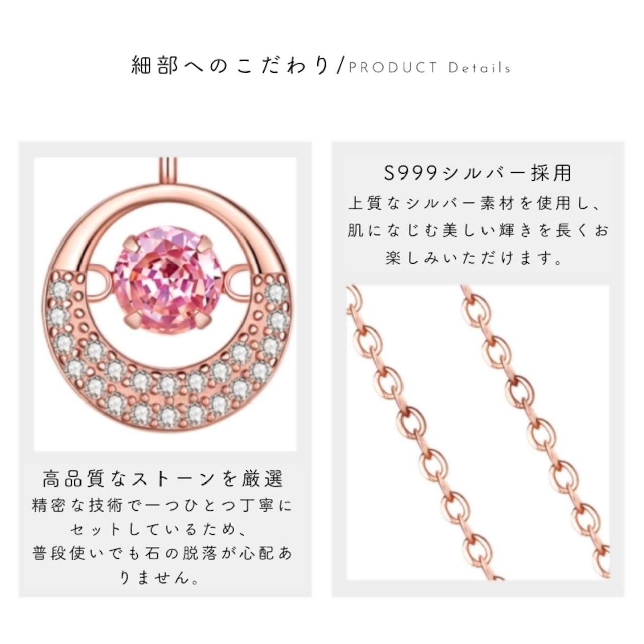 石は一つひとつ丁寧にセッティングされ、脱落防止に配慮。さらにローズゴールドモデルには変色防止のナノコーティングを施しており、より長く美しい状態を保ちます。