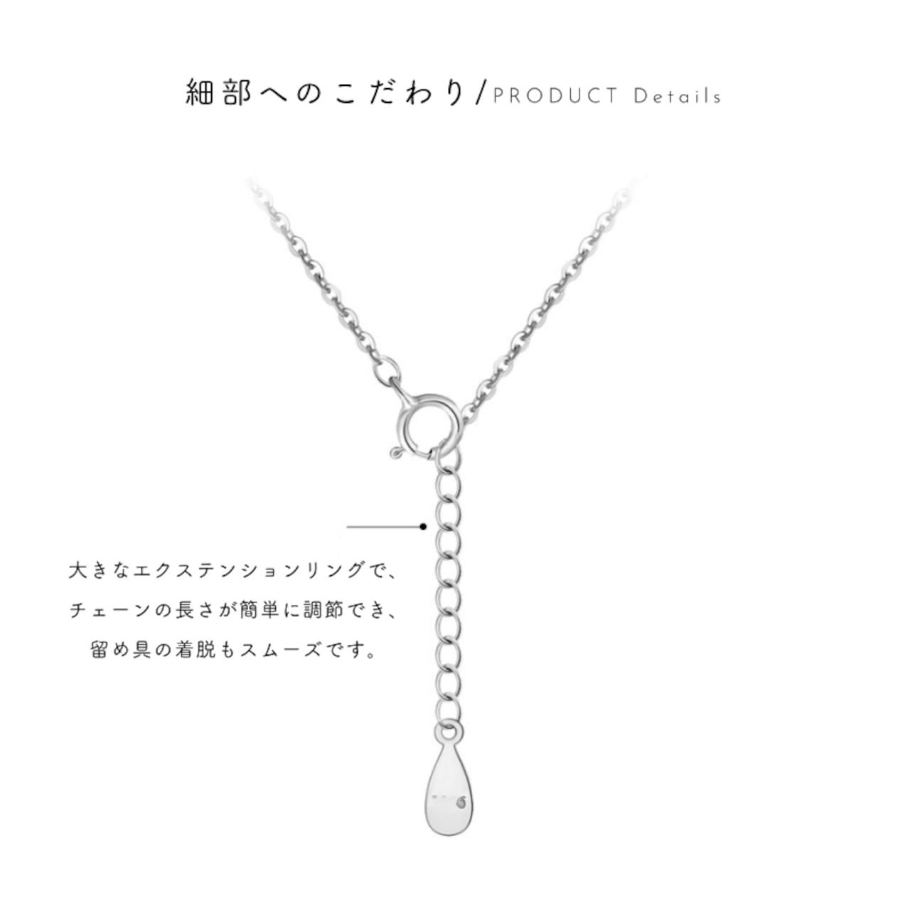 大きなエクステンションリングを採用しているため、チェーンの長さ調節が簡単。留め具の着脱もスムーズで、毎日の装着がストレスありません。