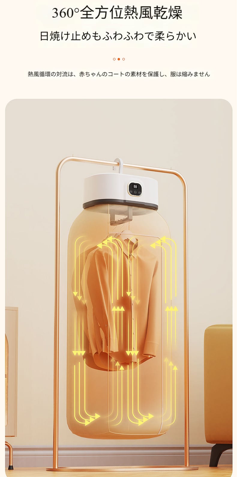 効率的で省エネなモーターと最適化された風路設計を搭載し、高速で温風を循環させ、乾燥時間を大幅に短縮。衣類は即乾燥即着用可能で、長い待ち時間とはおさらばです。