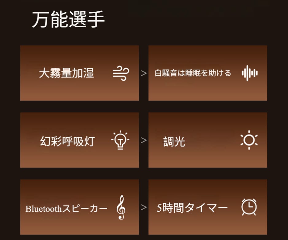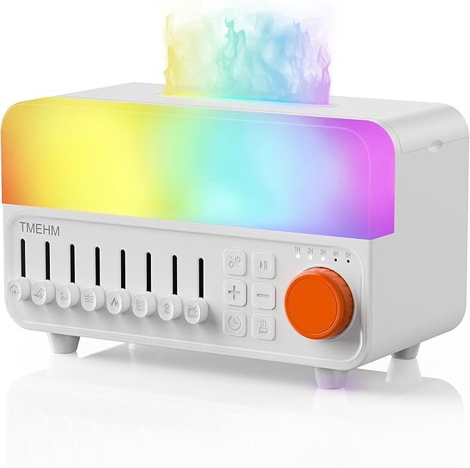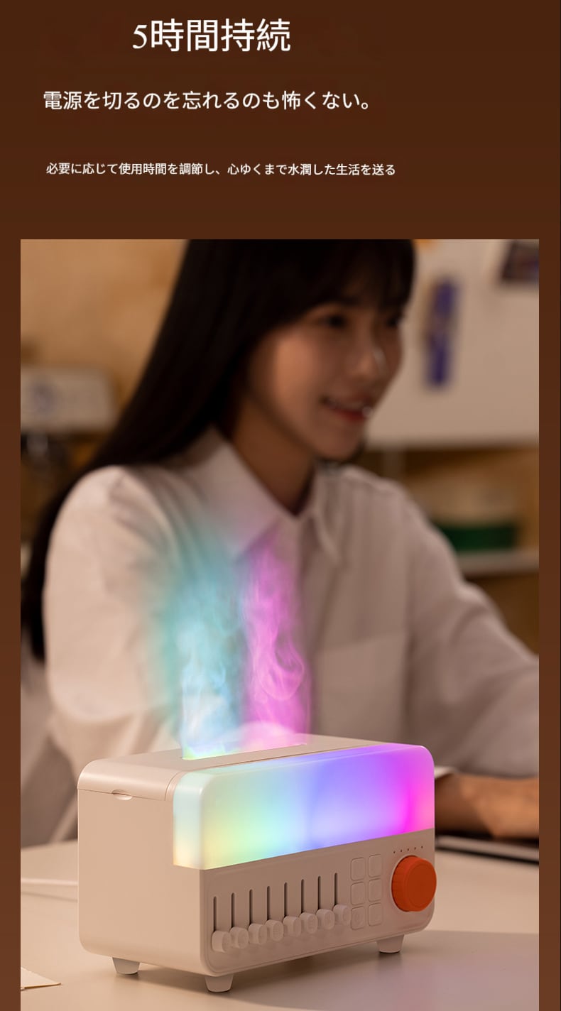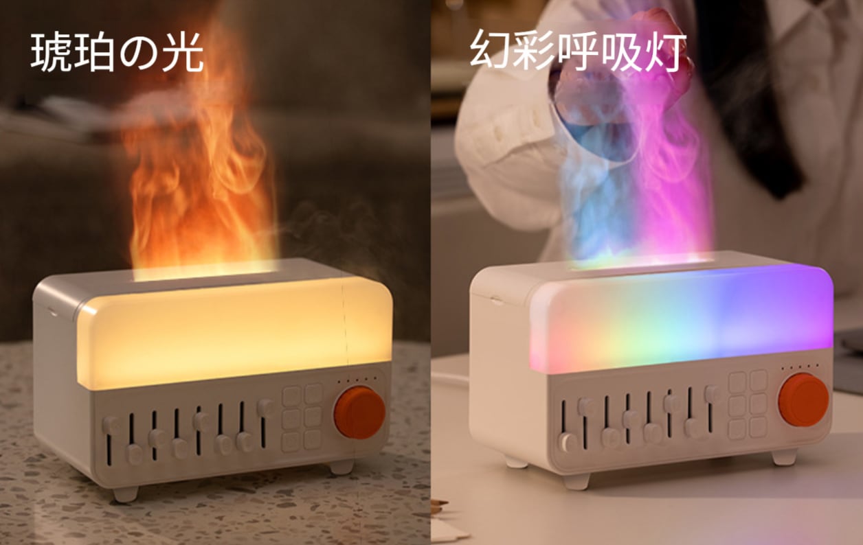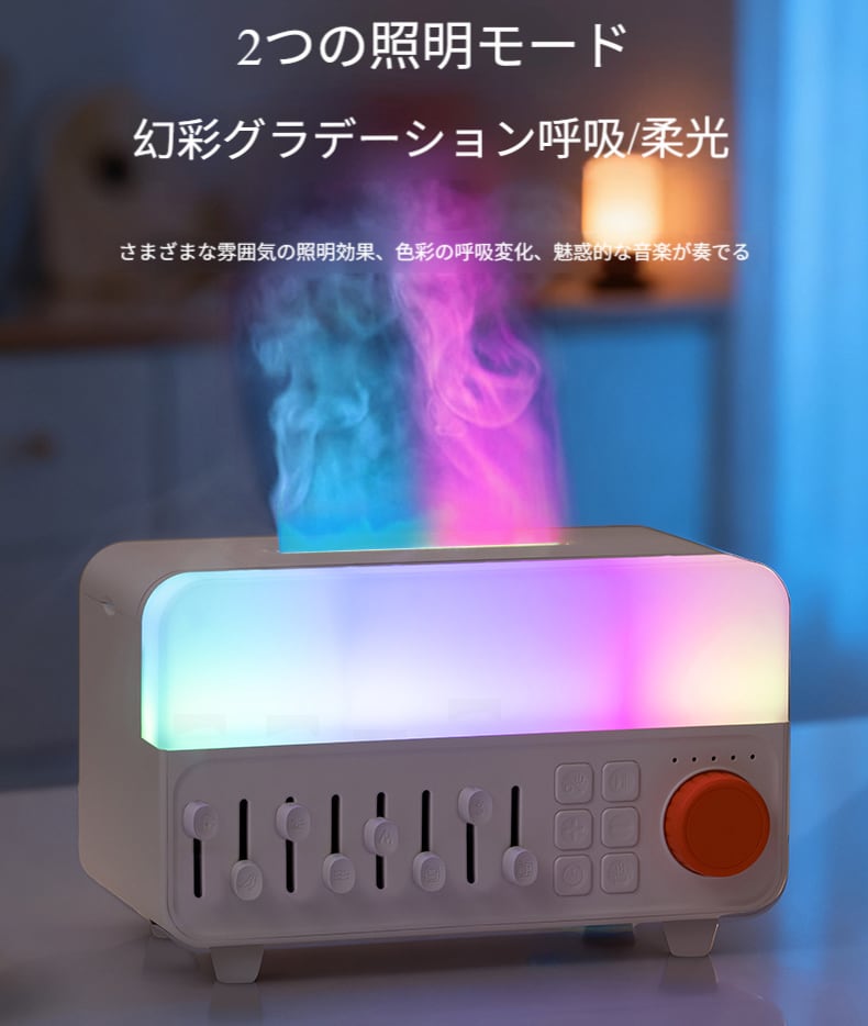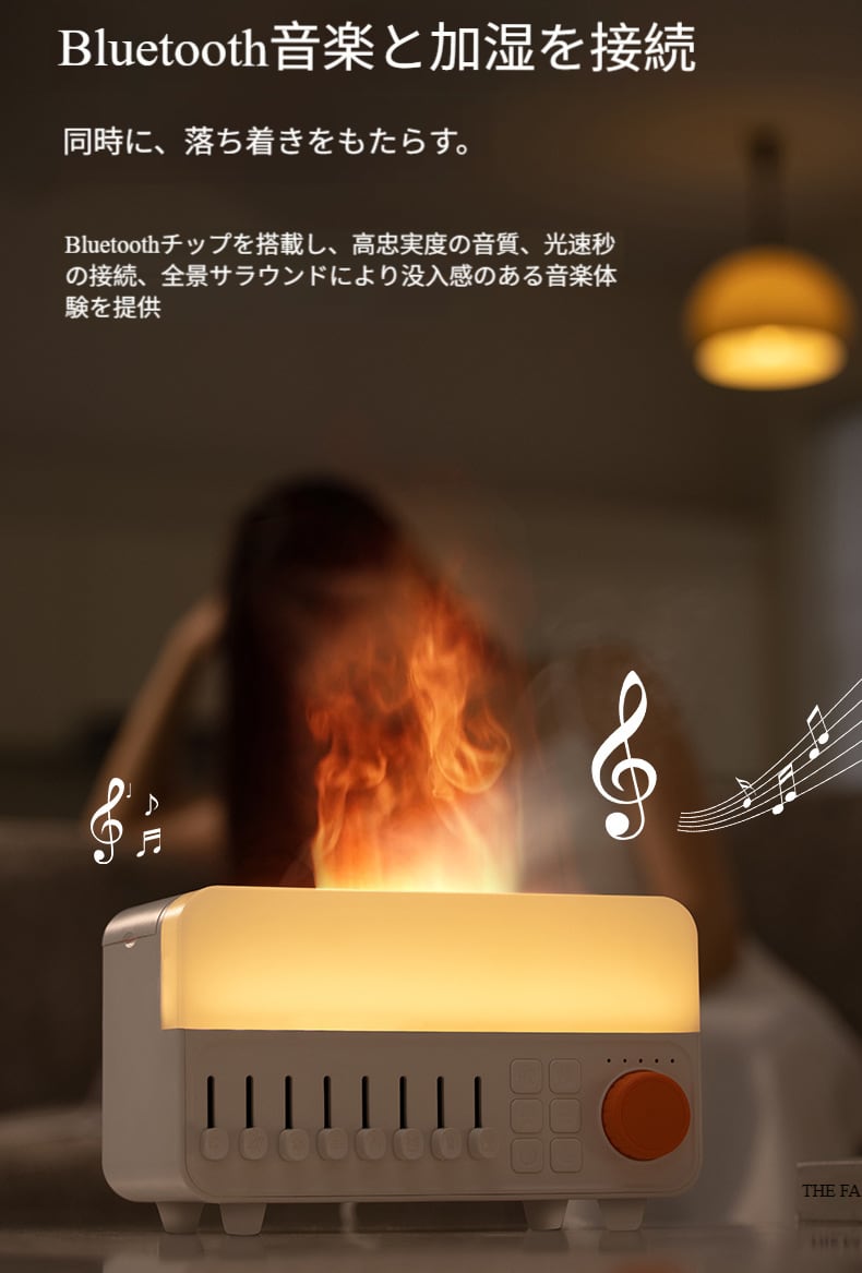 ホワイトノイズ付き炎型アロマディフューザー・加湿器 家用卓上小型 ブルートゥーススピーカー付き 眠り助けナイトライト