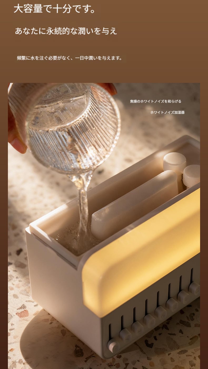 200mlタンクで最大6時間連続加湿可能。ナノレベルの超微細ミストが肌に優しく、乾燥を緩和。エアコン付きの部屋や秋冬シーズンに最適です。