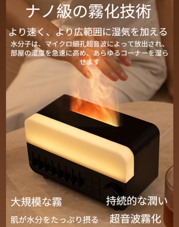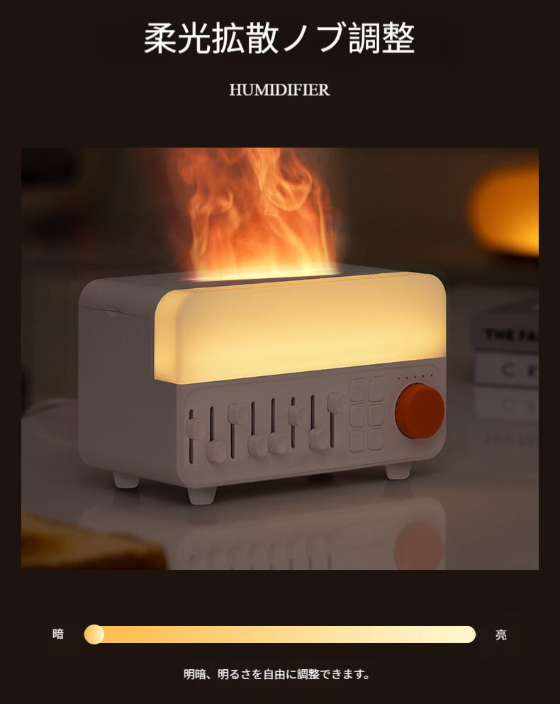 3段階の明るさ調節が可能。夜中の起き上がり時に目に優しく、雰囲気ライトとしても使用できます。ライトと炎の光の同期変化で、より幻想的な視覚効果を演出します。