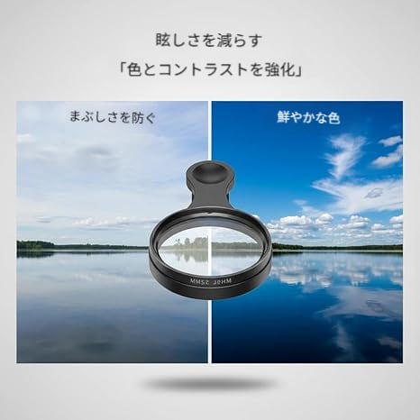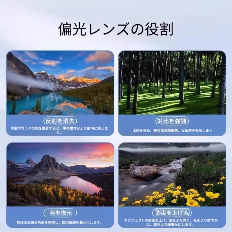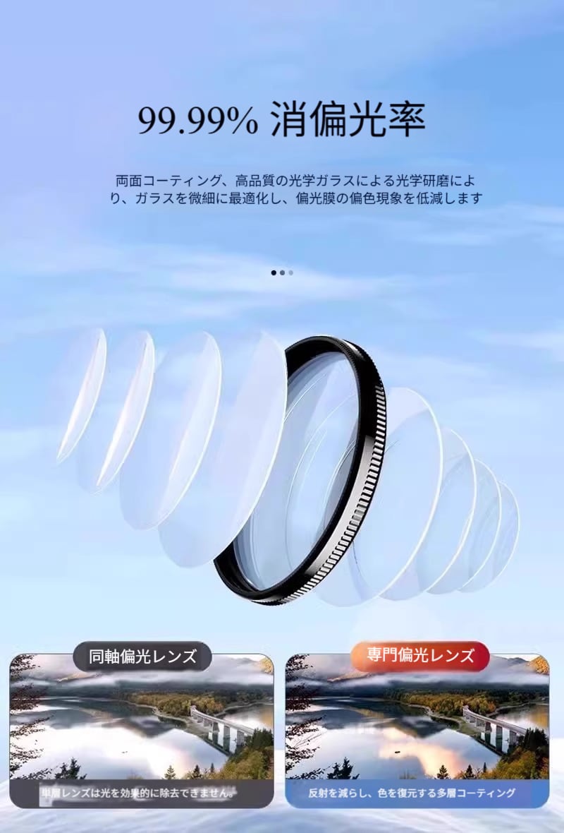 水面、ガラス、金属などの表面のグレアや反射光を効果的にフィルターし、青空をより澄みきり、雲の立体感を際立たせ、色彩の飽和度を著しく向上させます。