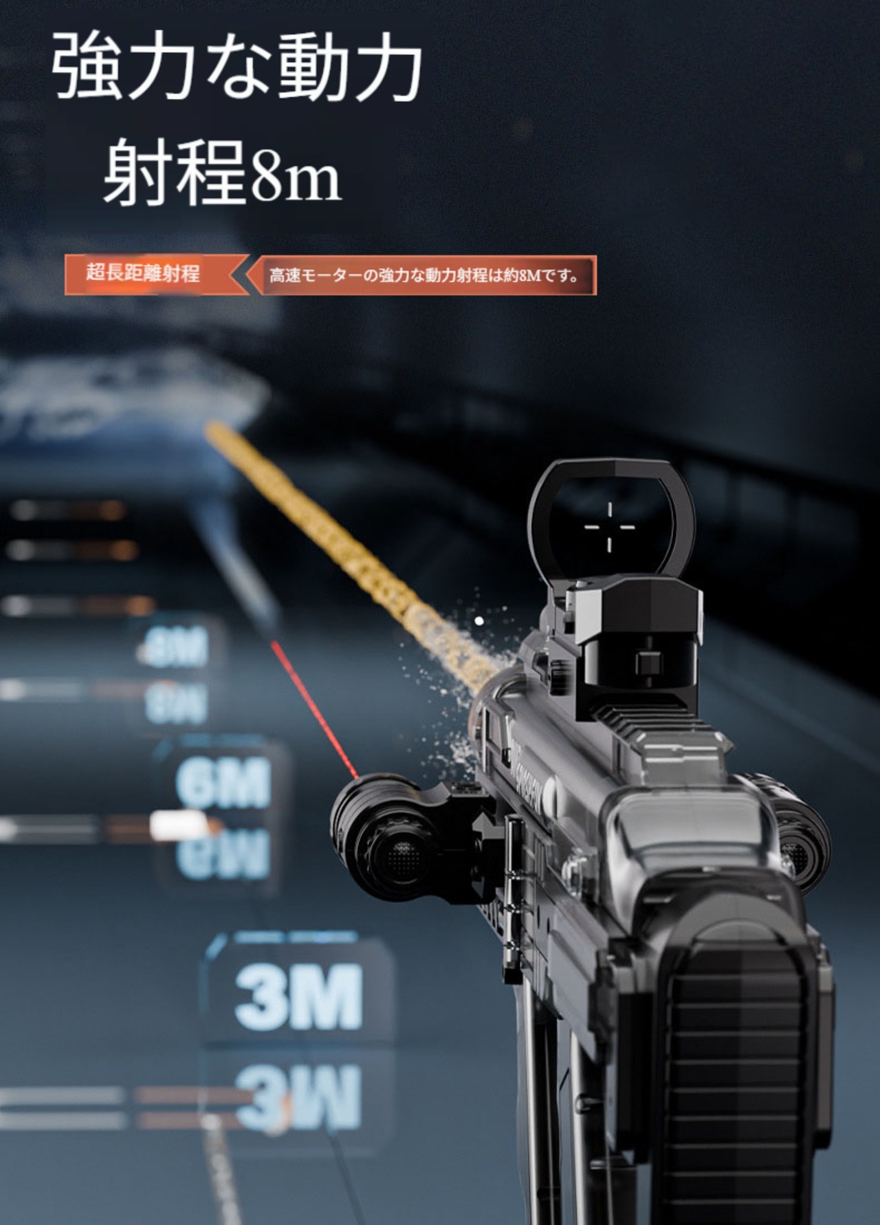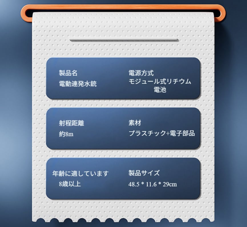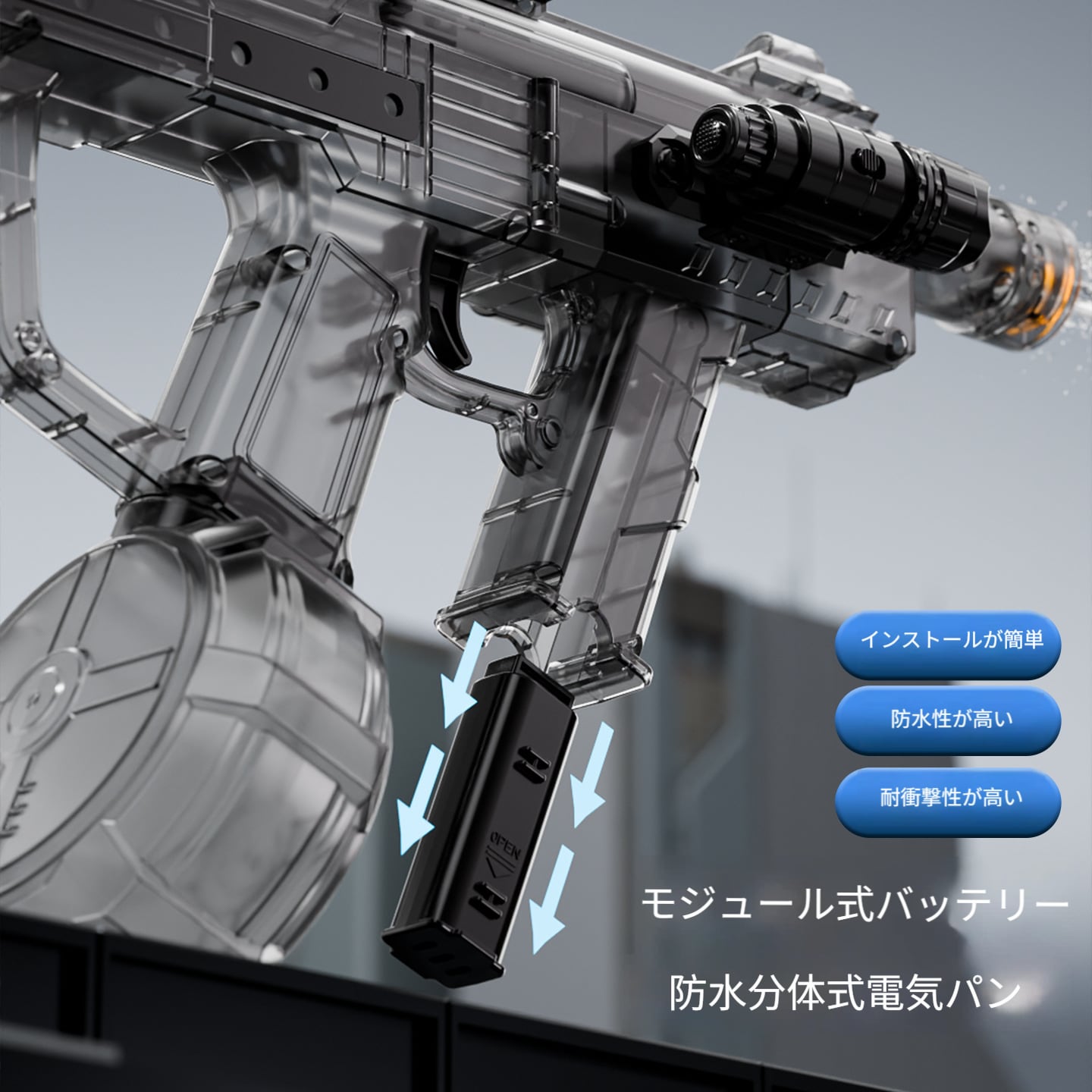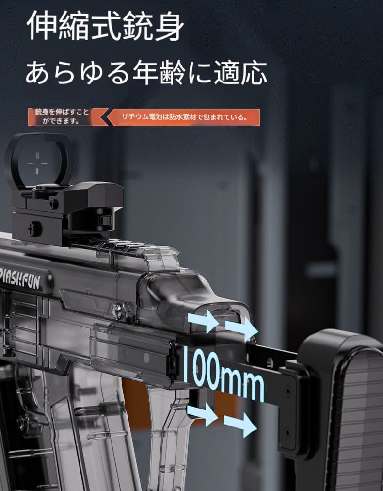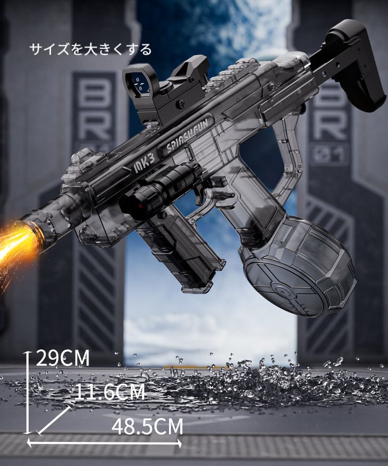 従来の水銃の単発モードを捨て去り、電動駆動で連続喷射を実現し、水遊びをより快適に楽しめます。