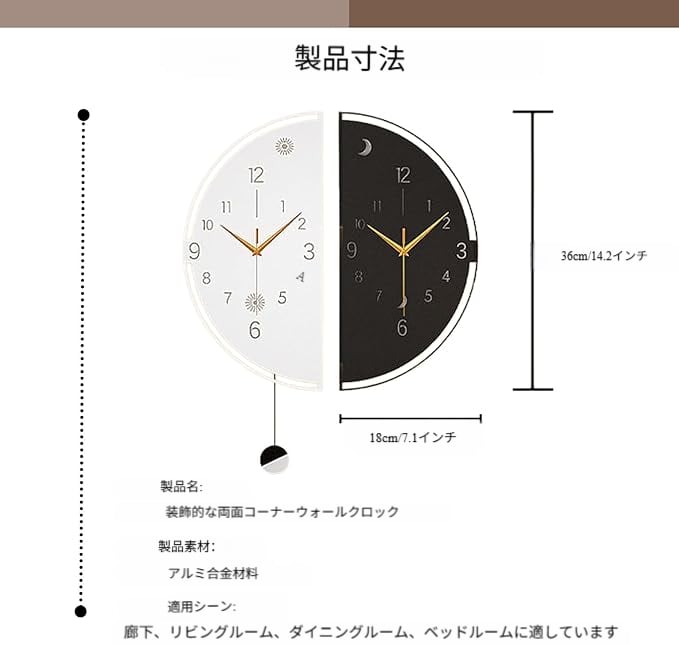 この掛け時計の最大の特色は、その革新的なコーナー両面デザインにあります。