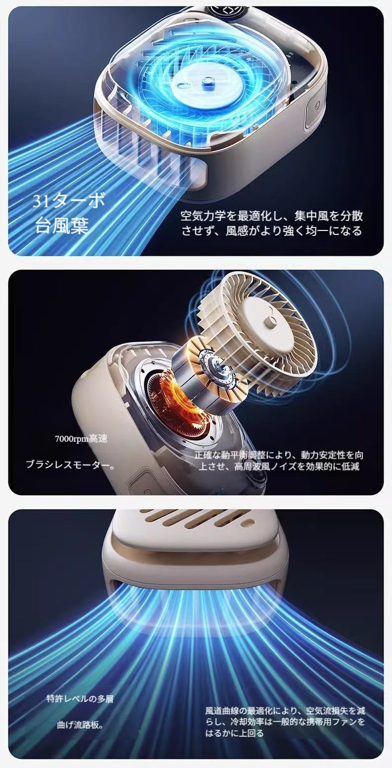 高効率直流ブラシレスモーターを搭載し、柔らかい自然風、強力な涼風、暴風速冷の3段階風速を提供。さまざまなシーンのニーズに対応します。