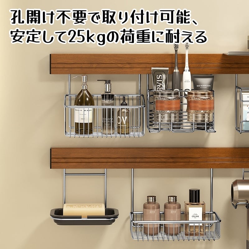 【簡単取り付け、簡単清潔】穴を開ける必要はありません。付属のテープでしっかり固定するだけで、迅速かつ簡単に取り付けられます。さらに、革新的なレールデザインにより、各ステンレス製バスケットを簡単に取り外し、食器洗い機に直接入れて徹底的に清潔にすることができます。これにより、類似製品で清潔にしにくいコーナーの問題を完璧に解決し、浴室を簡単に清潔で整頓された状態に保つことができます。